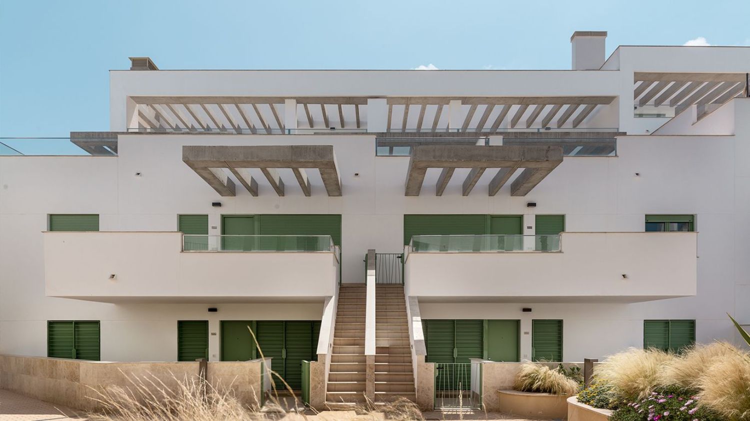 The community boasts impressive shared areas, including separate swimming pools for children and adults, leisure spaces, a solarium, and beautifully landscaped gardens, ideal for relaxing strolls or peaceful leisure time. Alongside these features, the newly constructed homes include penthouses with solarium-covered roofs and expansive terraces. The design of the complex maximizes the natural topography to ensure that most residences enjoy spectacular sea views. The community is designed as a private enclave to ensure security and comfort, boasting vast communal spaces equipped with pools, leisure areas, a solarium, and gardens for ultimate relaxation—all situated just a two-minute walk from the beach.