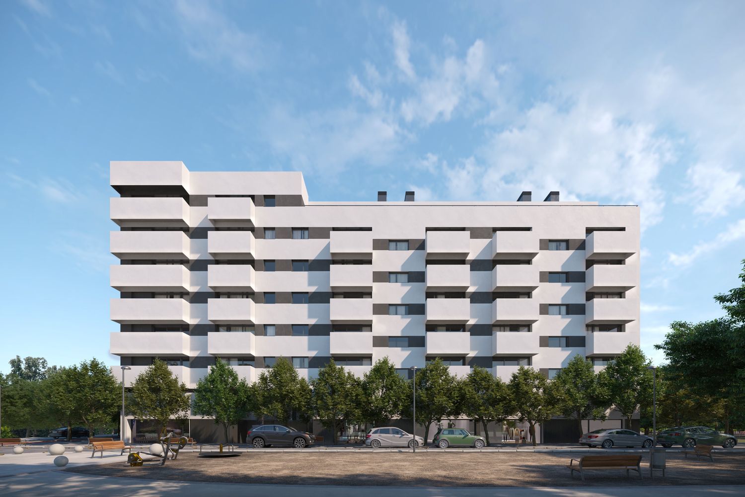On the other hand, the L-shaped building, positioned at a strategic point of convergence, houses 50 homes across six floors, including two penthouses with panoramic views of both the communal area and the vibrant promenade. This development stands as an exemplar of environmental and urban excellence.
