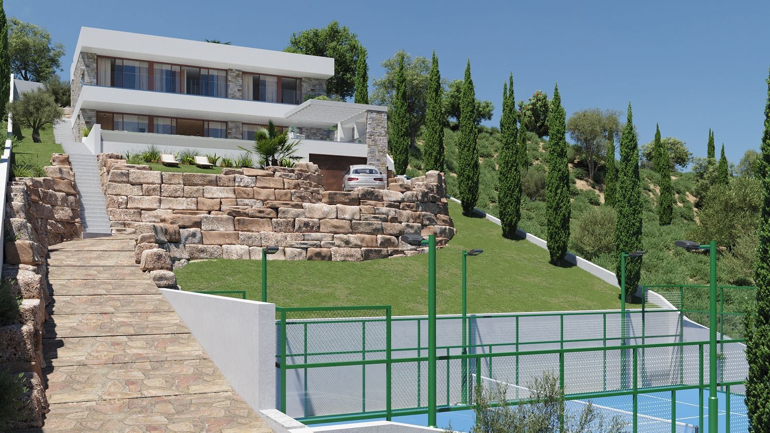 Upstairs, a workspace accompanies two suite bedrooms and a master suite with a dressing area and a luxurious bath complete with a small sauna. This level provides access to a private, landscaped rear garden with a substantial terrace. Sport enthusiasts will appreciate the private paddle court. The house harmonizes with its natural surroundings, prioritizing Mediterranean sea views with thriving gardens encircling it. Built with a traditional concrete structure, flat roofs, and stone walls, its linear and space-efficient design embodies the developer's style while ensuring that each dwelling in this exclusive development stands uniquely apart.