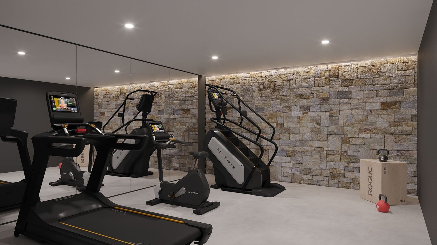 The basement, stretching 302 m², efficiently houses more than just a four-car garage. It hosts a recreational space with a gym, home cinema, a compact wine cellar, and a game room, complemented by a bathroom, laundry, and elevator. The main entrance opens into a living-dining area and a fully integrated kitchen with a central island. A bathroom and an English patio serve a suite bedroom and a versatile room, potentially a uniquely themed office. This floor seamlessly extends outdoors to a grand terrace with an infinity pool, barbecue, and summer kitchen.
