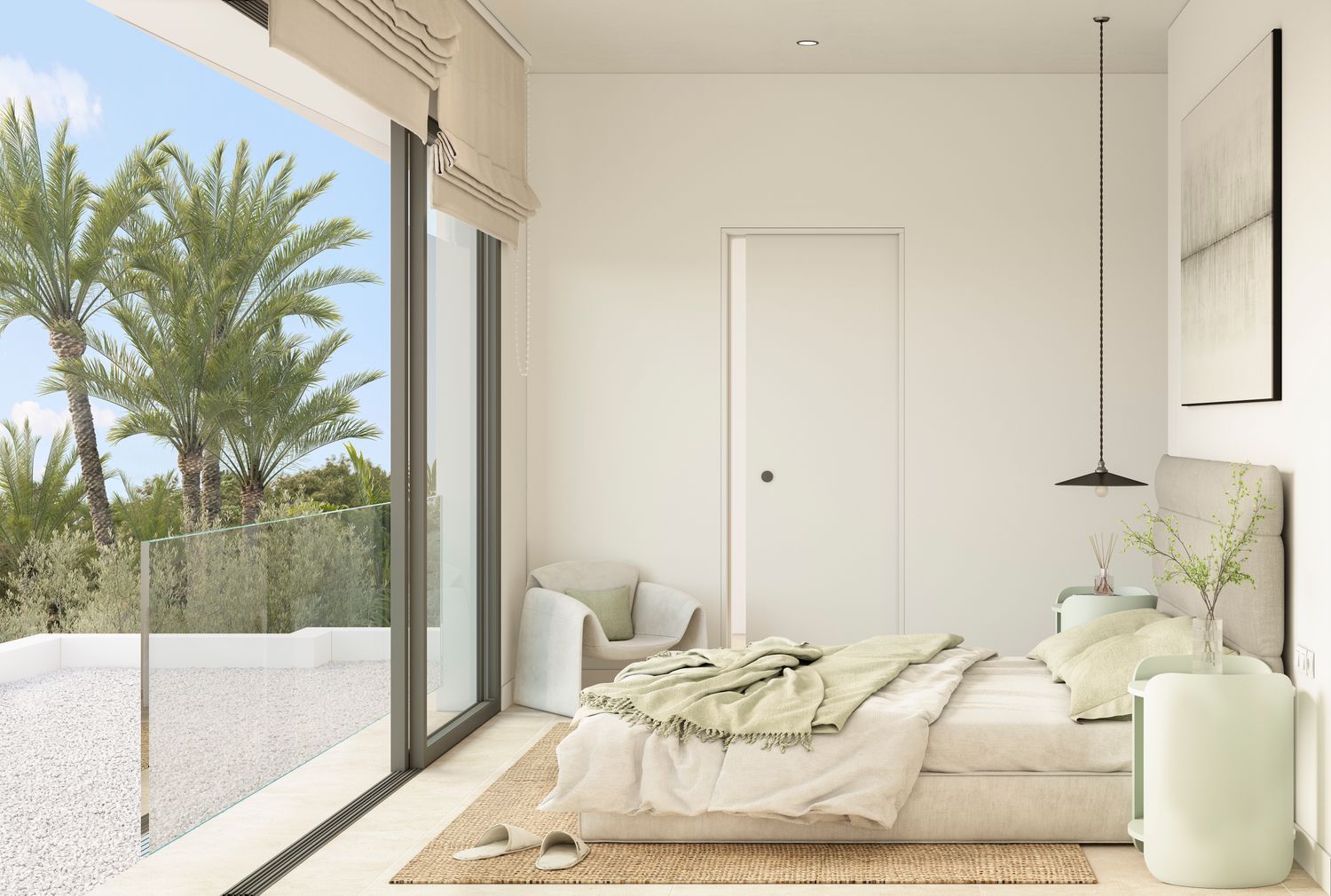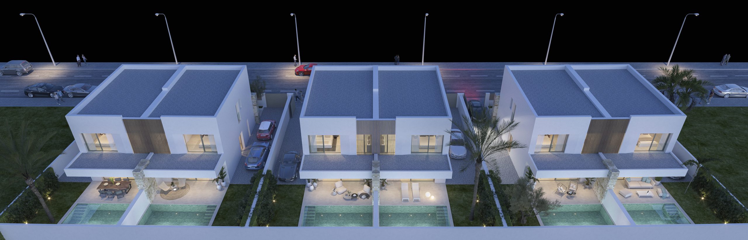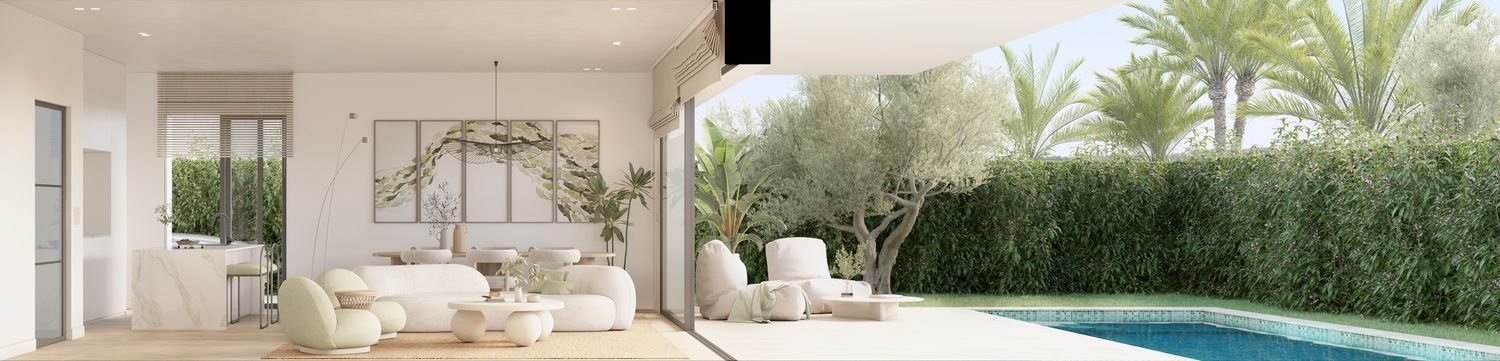 Situated with easy access to the A-7 highway, this development is surrounded by vast green spaces, as well as educational, sports, and shopping facilities. Its sleek, modern, and minimalist construction style harmonizes with the natural setting, where the elegance of white, wood, and natural stone finishes offers a serene Mediterranean ambiance. The superior quality of chosen materials is evident throughout.