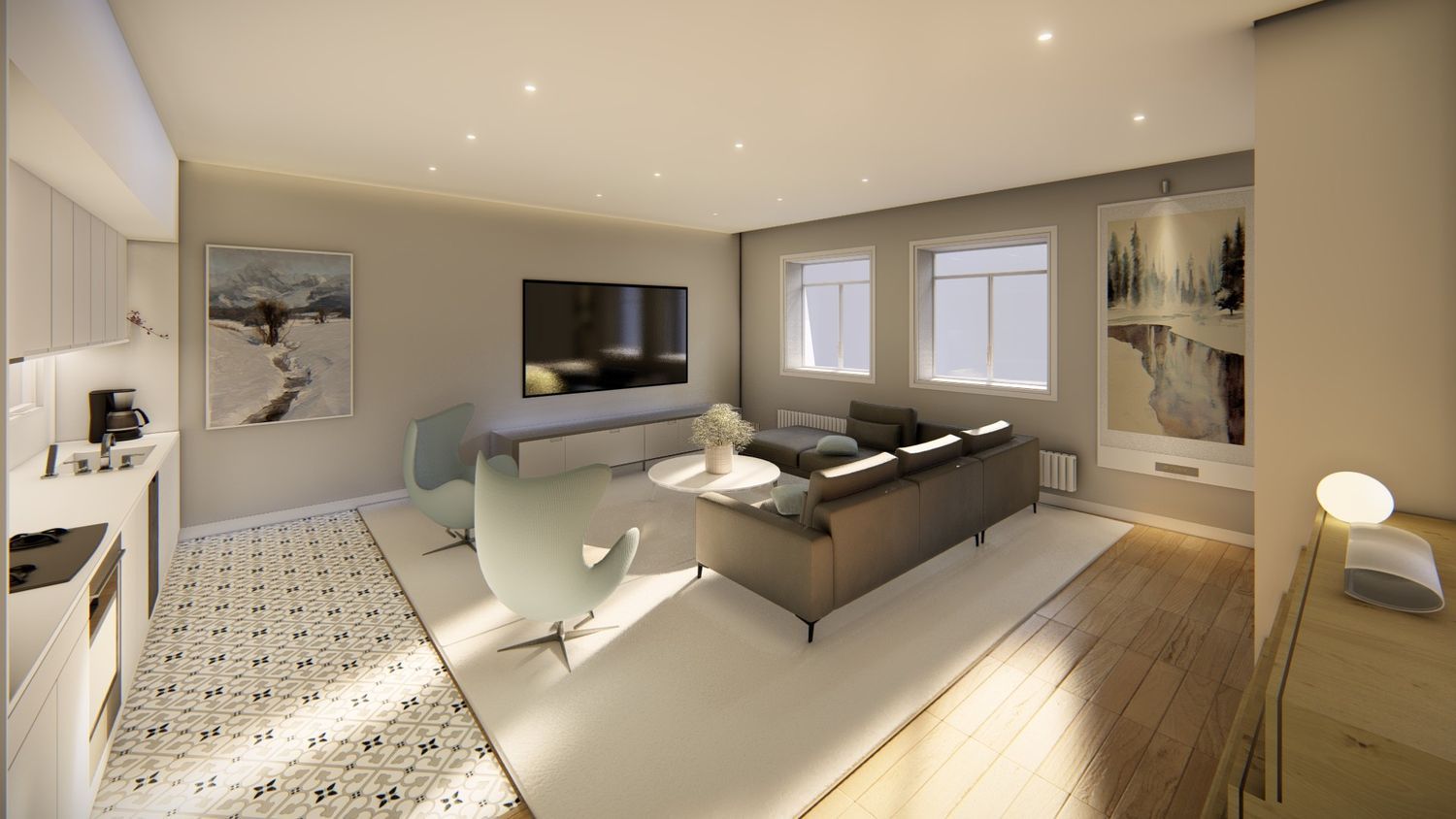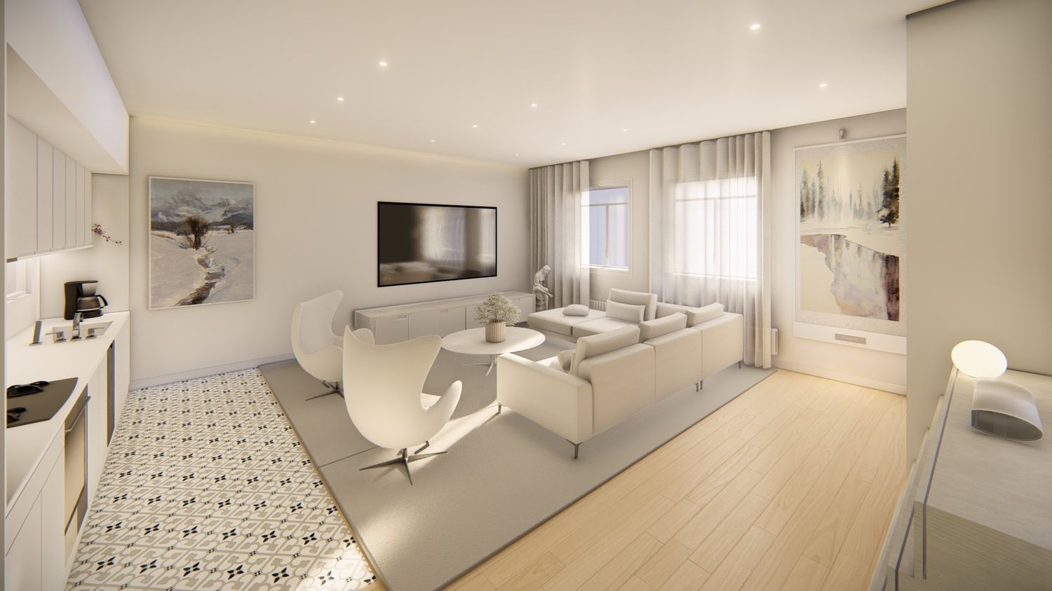 The kitchen comes fully equipped with premium furnishings from renowned manufacturers and high-end appliances, including an oven, induction cooktop, exhaust hood, frost-free refrigerator, and dishwasher. Throughout each apartment, you’ll find smooth white plastic paint and suspended ceilings, creating a seamless living environment. Kitchens, bathrooms, and wet areas feature porcelain stoneware tile, while the rest of the apartment boasts multilayer floating oak flooring or its equivalent, completed with white skirting or color-coordinated with the flooring.
