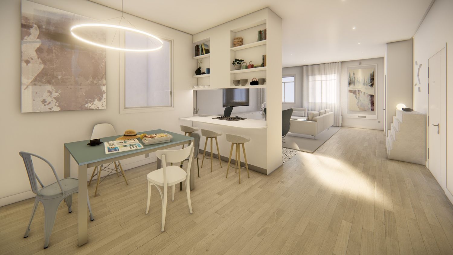 Each unit benefits from individual gas condensing boilers for heating and a domestic hot water system supported by aerothermal pumps or solar panels. The revamped lightweight roofing extends the building vertically one more story. The exterior frameworks are crafted from aluminum with thermal break and double glazing, complemented by monoblock shutters in the sleeping areas. Interior woodwork includes fully-lined, custom-fitted wardrobes, available with either swing or sliding doors tailored by the architectural direction, featuring sleek matte stainless steel or integrated handles. Doors and cabinetry are finished in matte white lacquer with matching hardware.