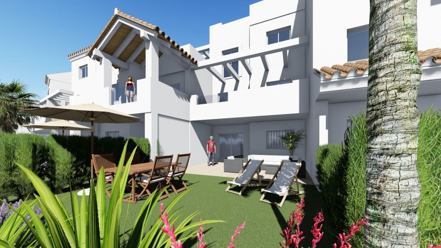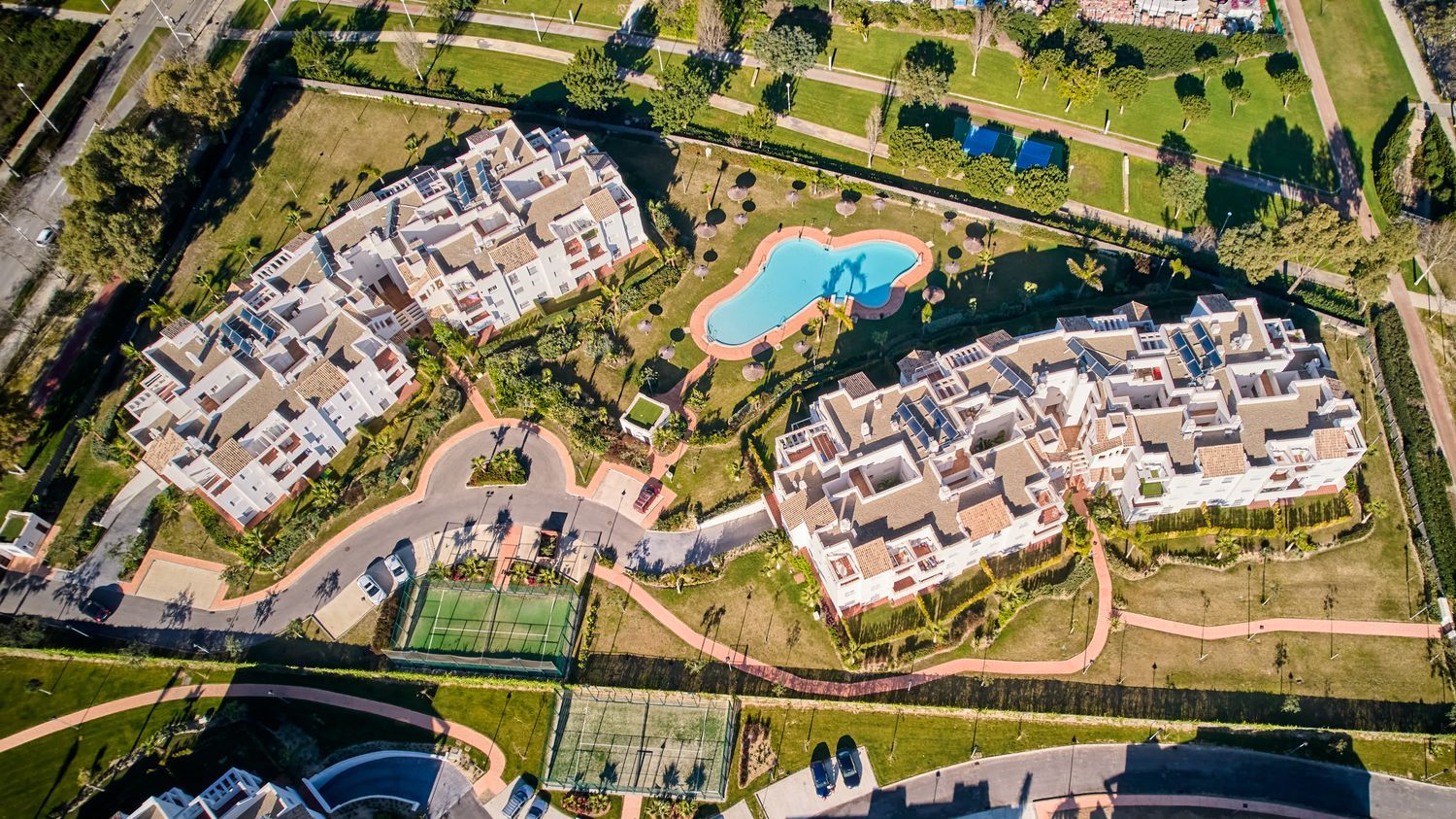 presents 148 stunning Mediterranean-style properties. The striking white architecture against the eternal blue sky creates a breathtaking view. Each home complements its surroundings with amenities including a pool, paddle courts, and expansive green spaces.