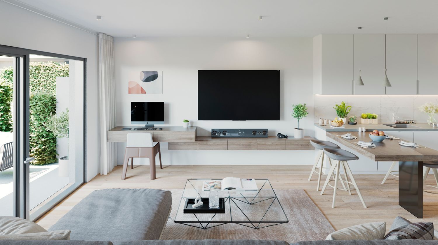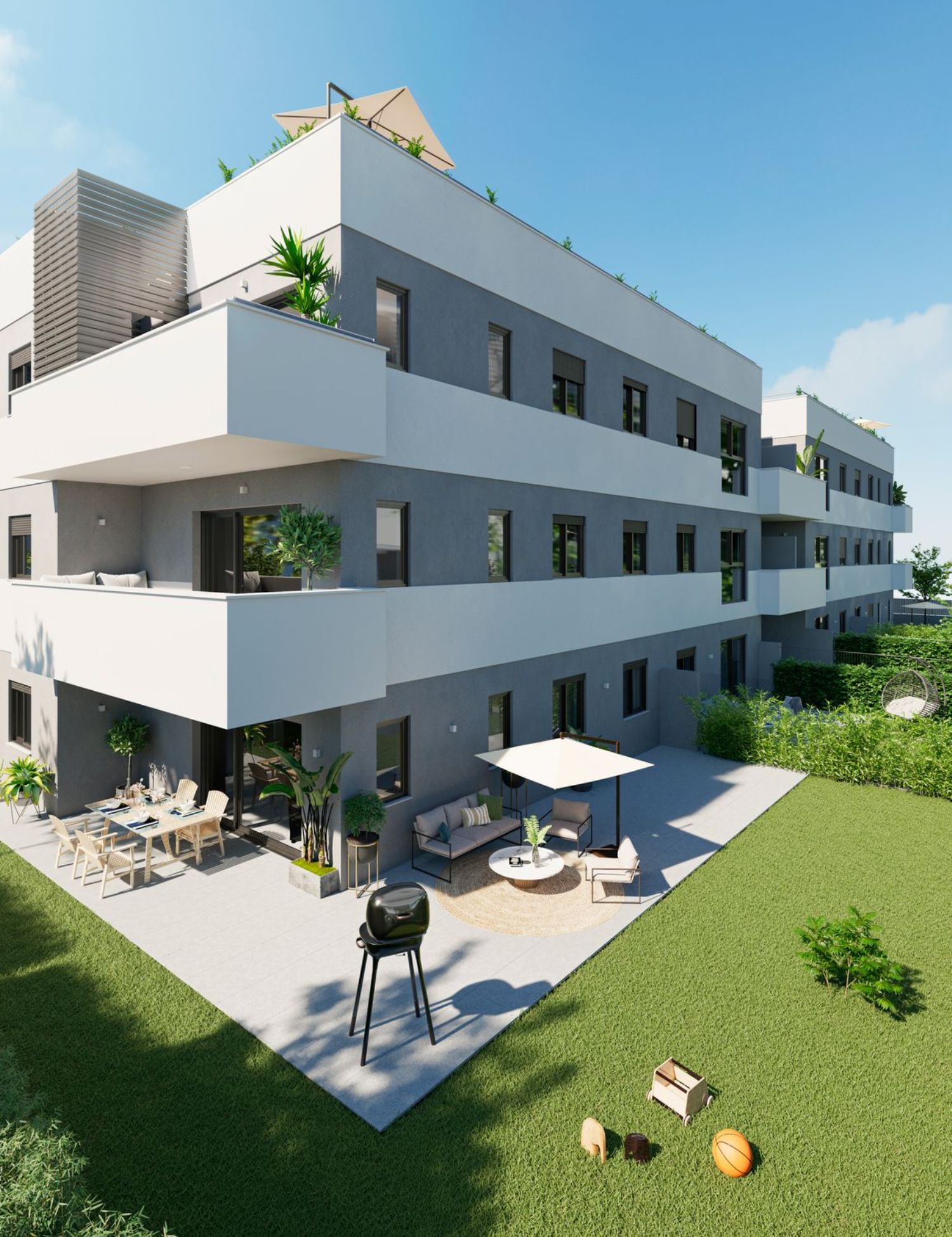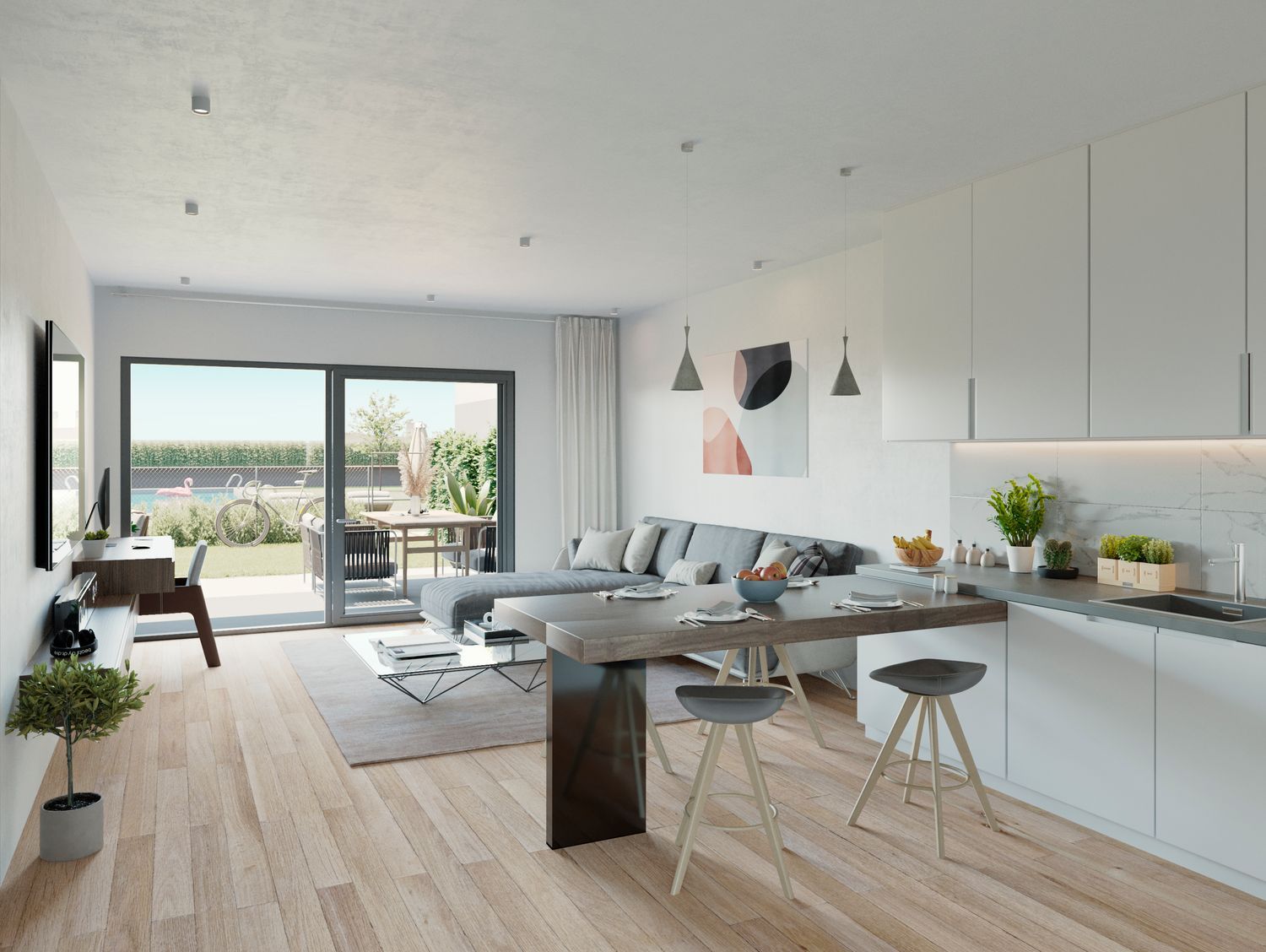 The properties available encompass one to three-bedroom options, featuring up to two bathrooms. There are stunning penthouses with solariums, apartments with large terraces, and ground-floor homes with private gardens. Expansive windows allow natural light to flood the interiors, creating a warm and luminous atmosphere in both the living room and kitchen.