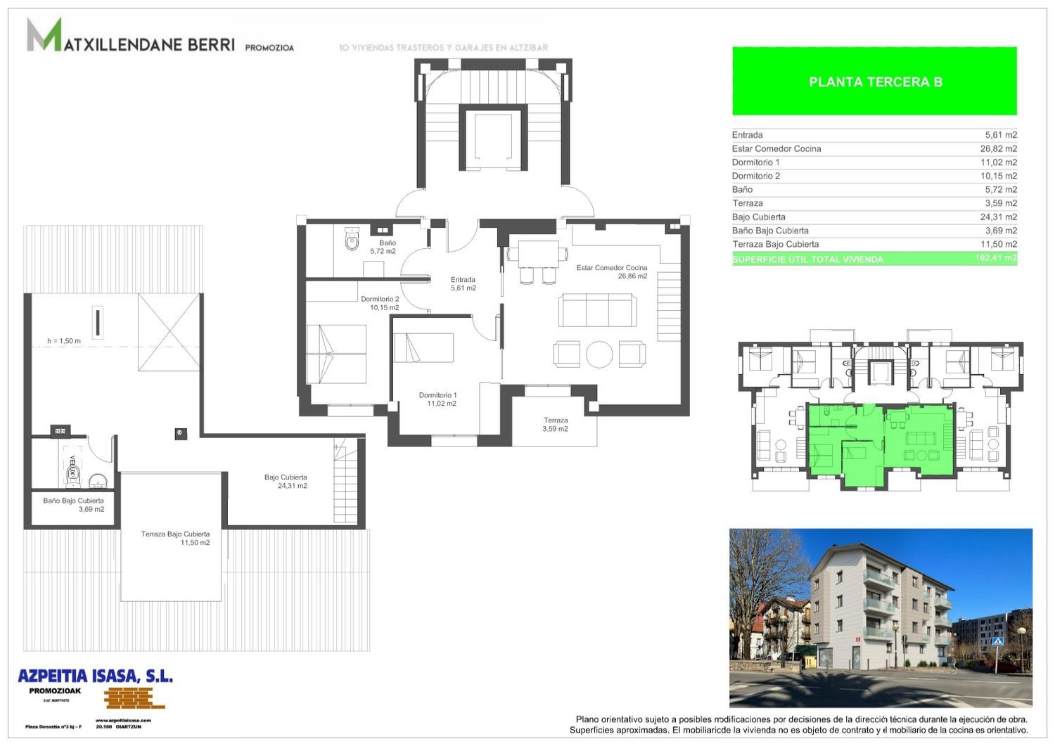 The third-floor duplex offers a spacious and elegant layout, consisting of a living room, kitchen, two bedrooms, two bathrooms, two expansive terraces, and an attic. Located centrally in Altzibar, these homes boast dual orientation, allowing for natural light to flow throughout the space, and are crafted using top-tier materials, ensuring both quality and durability.