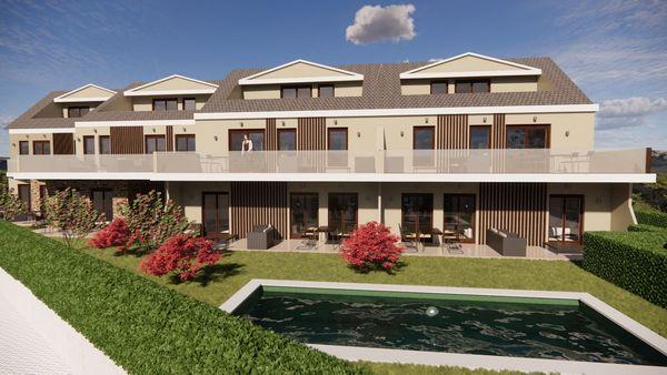 In the attic, a 20 m² terrace offers panoramic views of the garden and countryside, with the potential to create a large double bedroom with a dressing room and en-suite bathroom, or two double bedrooms with a shared bathroom. The development includes surface garage space and community gardens highlighted by a pool surrounded by grass, providing an ideal setting for relaxation and recreation.