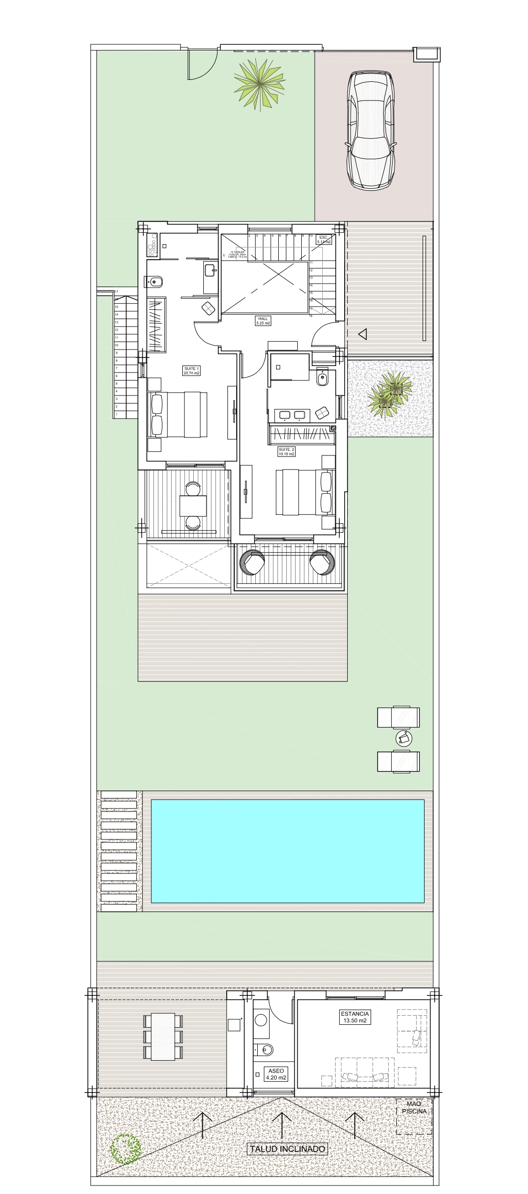 A significant advantage of these villas is the independent guest house, situated on a single level, featuring one bedroom, a full bathroom, and a charming terrace overlooking the garden. This space is perfect for hosting guests or serving as a private work or relaxation area.