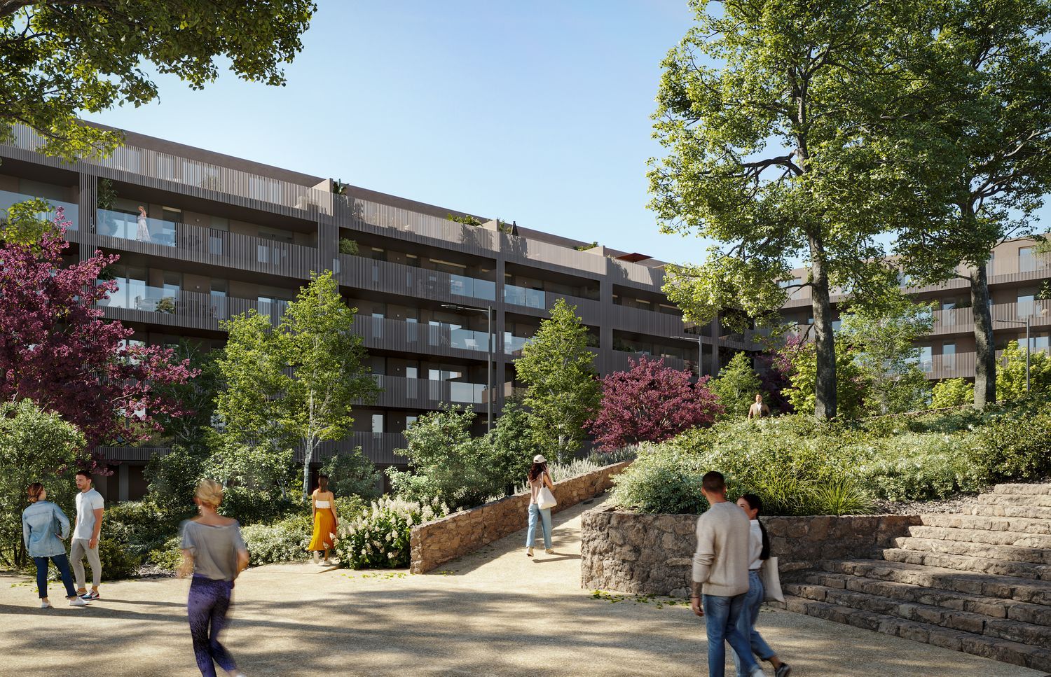 The building itself is a natural extension of its setting, seamlessly integrating with the surrounding gardens. Its contemporary and elegant architecture combines organic elements and sustainable materials, enhancing the natural beauty of the area. The development offers homes ranging in price from 158,550 € to 495,000 €, with living spaces between 58 m² and 190 m² to perfectly suit your needs.
