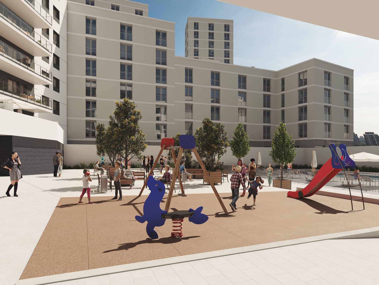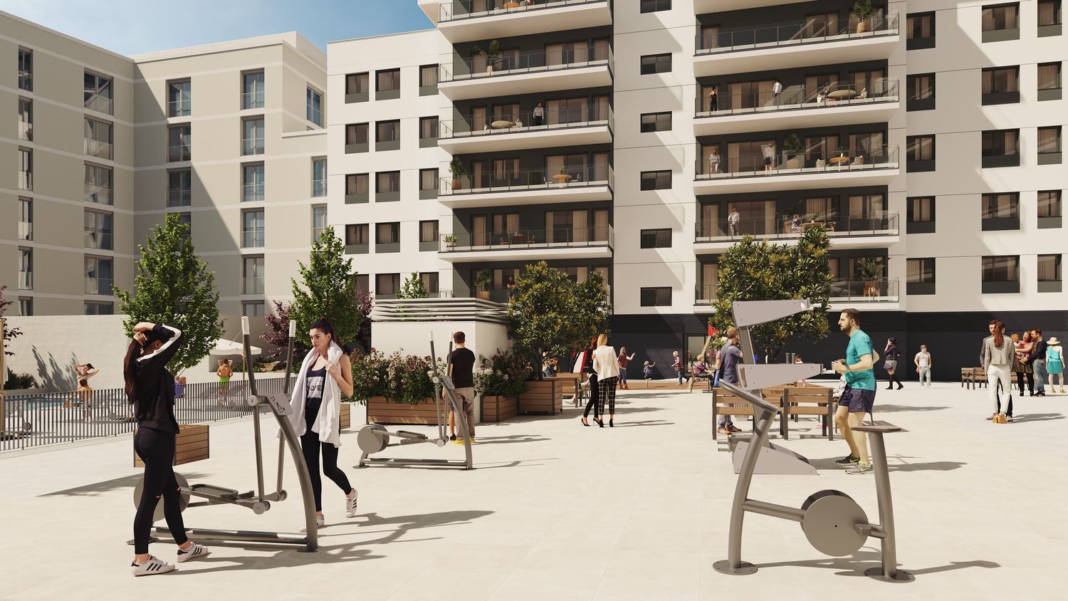 presents a contemporary and inviting architecture, where each residence boasts generous terraces. The design emphasizes the use of sustainable materials, promoting energy efficiency and enhancing both comfort and well-being. This residential community also features exceptional shared amenities, including a communal swimming pool, sun deck, outdoor gym, lush green areas, and a playground for children. Furthermore, a space equipped with a full kitchen is available to host community gatherings or children's parties, ensuring delightful moments in close connection with nature.