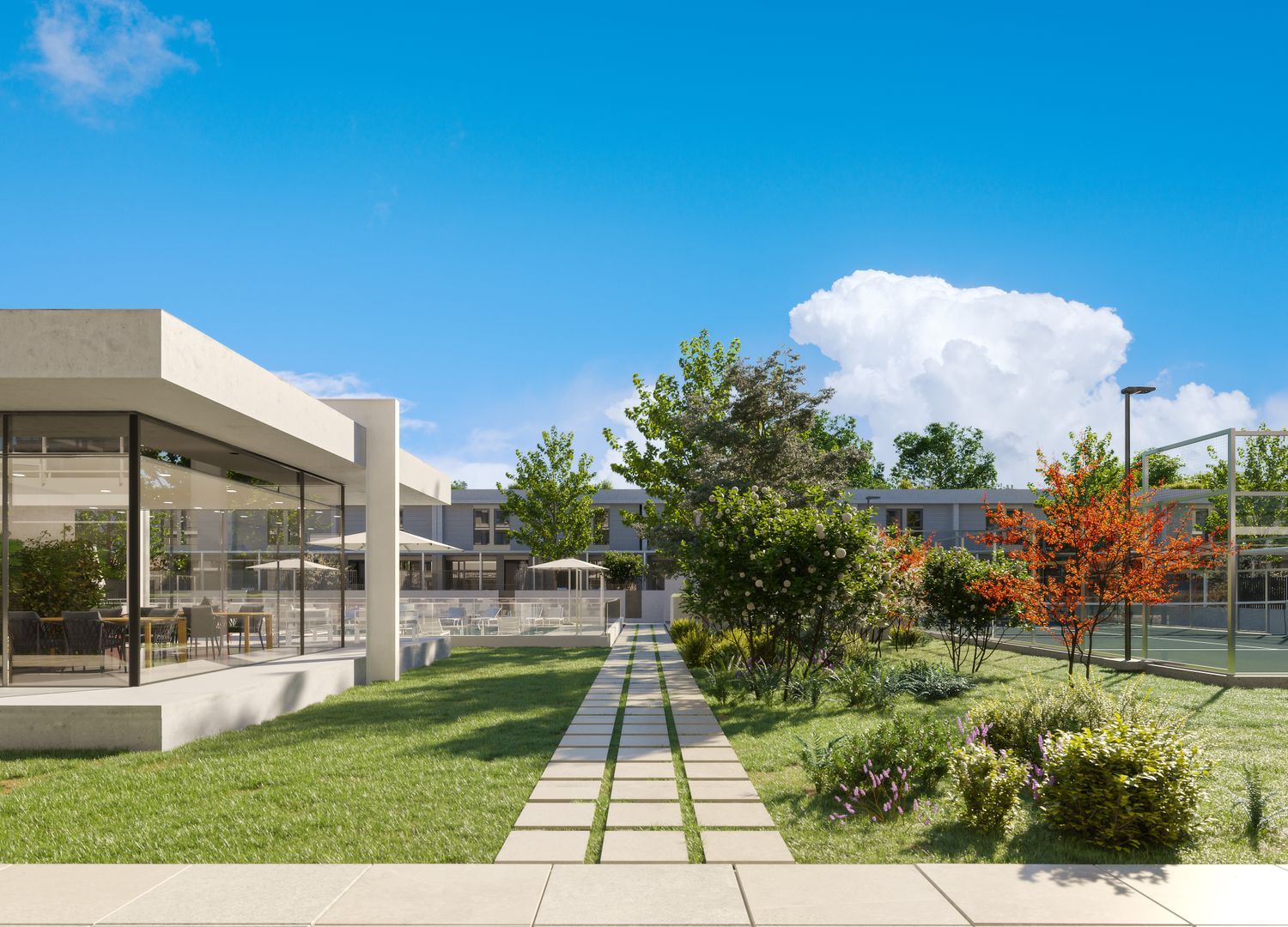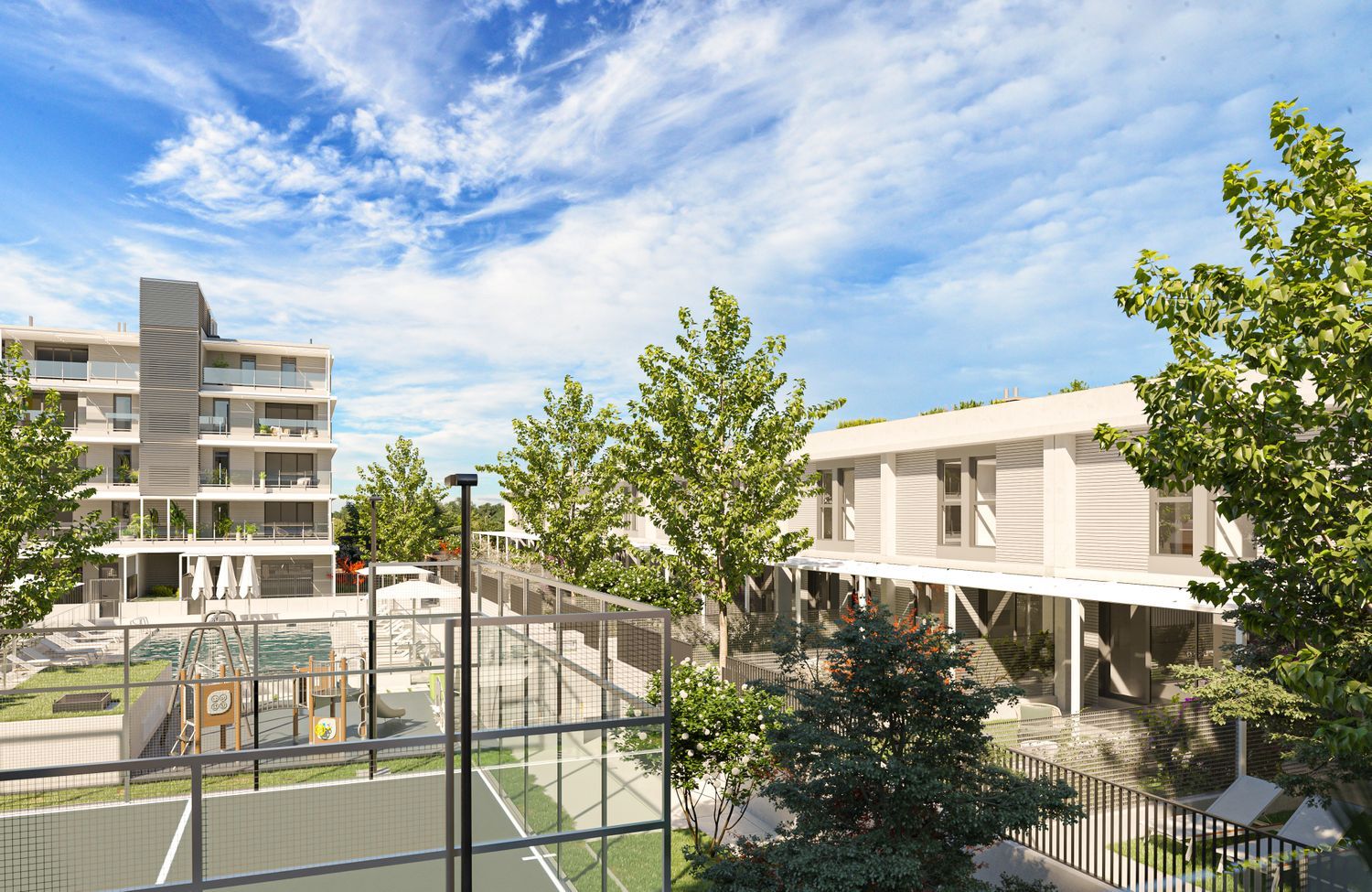 Residents will enjoy a range of shared amenities that include a large communal swimming pool with a sun deck, a paddle tennis court, a gym, a gourmet room, and a landscaped children's play area. Every property features an expansive living and dining area with terraces, a fully equipped kitchen with modern appliances, and climate control through an advanced underfloor heating and cooling system powered by aerothermal technology. The construction holds the Breeam sustainability certification, ensuring superior construction quality, and enhanced thermal and acoustic insulation.