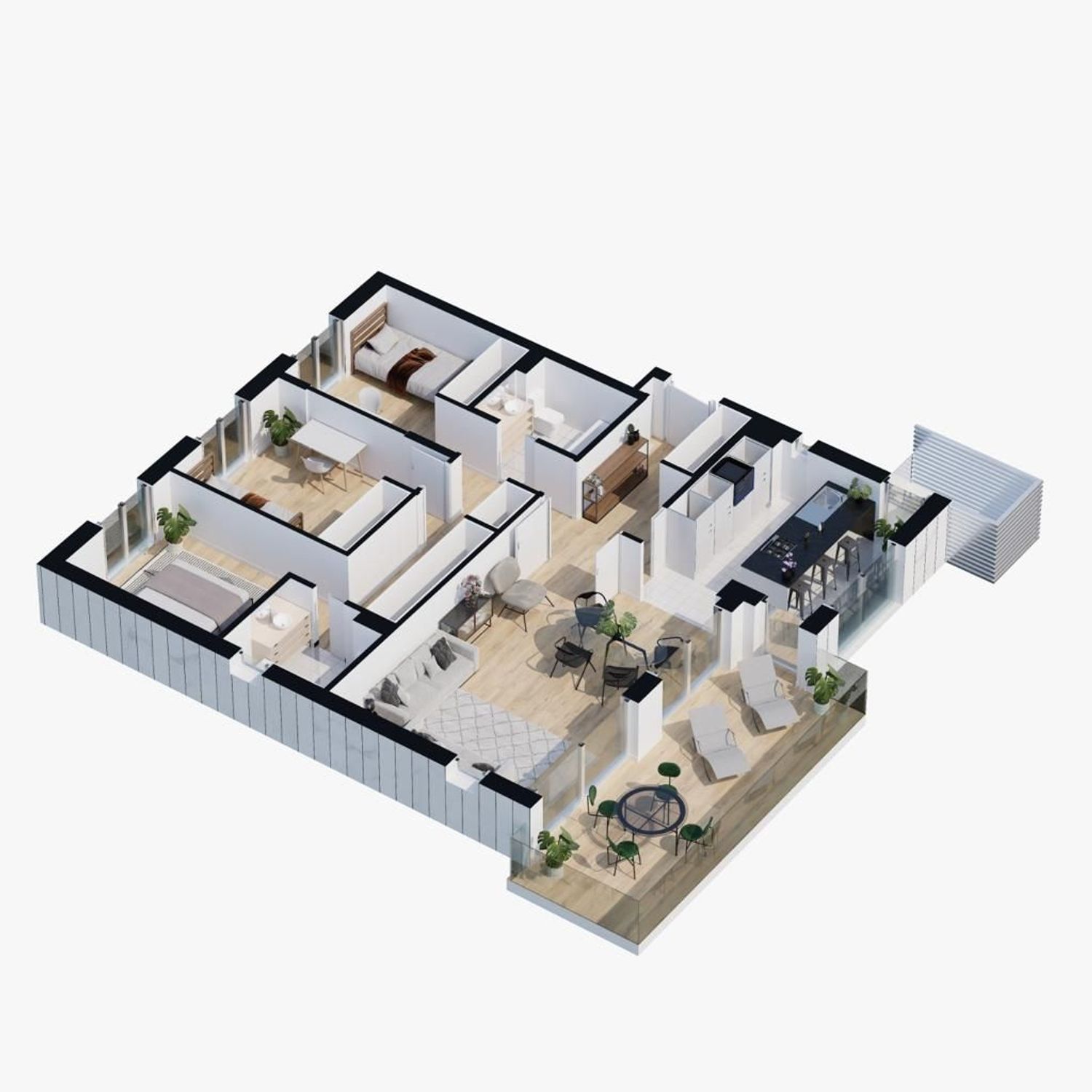The apartments are fully equipped with modern kitchens, complete with high-quality cabinetry and appliances. Each unit includes two spacious bathrooms, distinguished by premium flooring and fixtures, featuring a sleek shower base and/or bathtub. The interior design is complemented by ceramic wood-effect flooring throughout, creating a warm, inviting atmosphere.