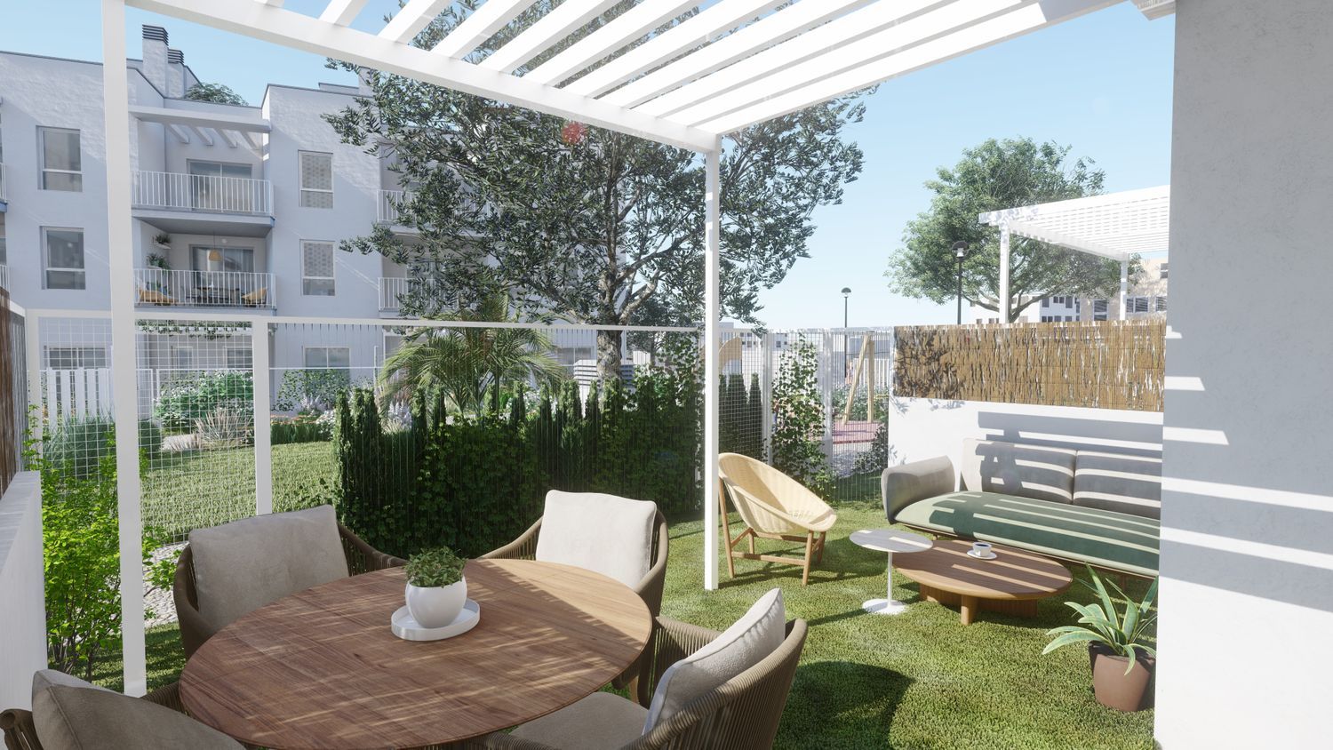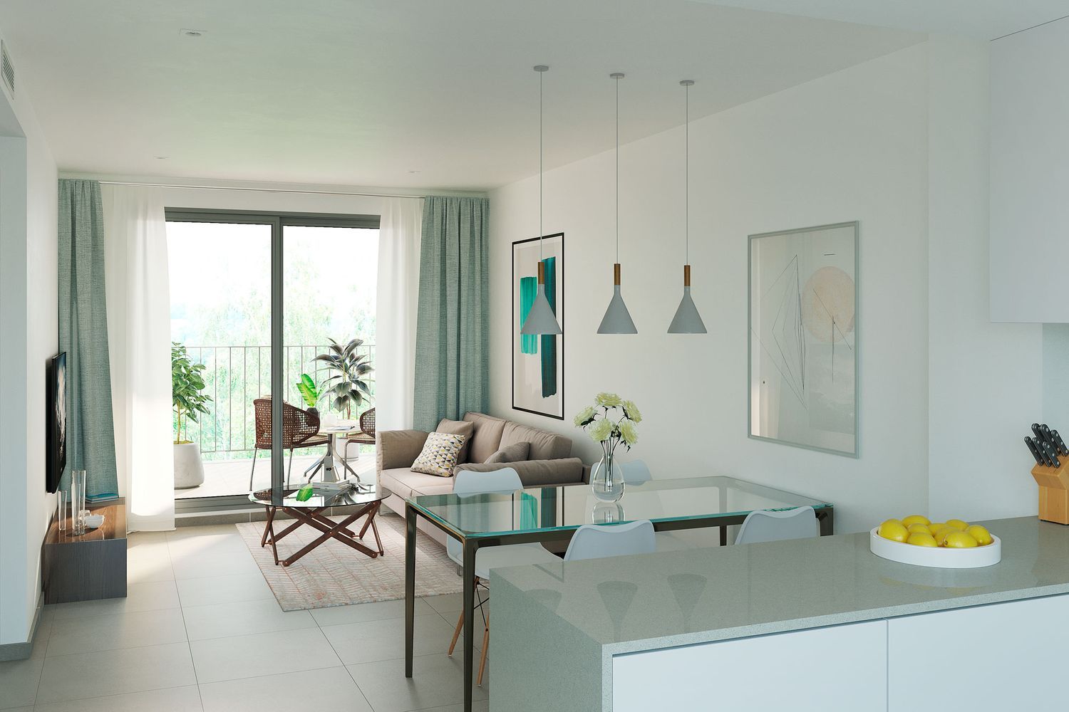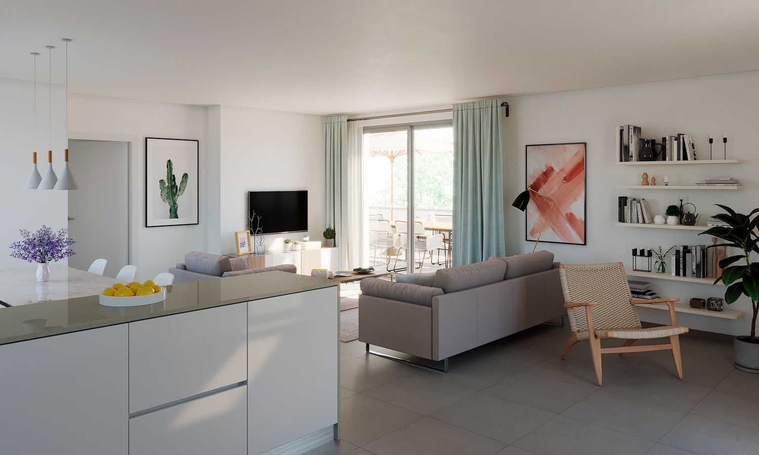 Most units are outfitted with two bathrooms, one conveniently located in the master bedroom. The open-plan kitchens are well-equipped and extend into the living room, which leads onto a terrace, perfect for enjoying the pleasant weather.