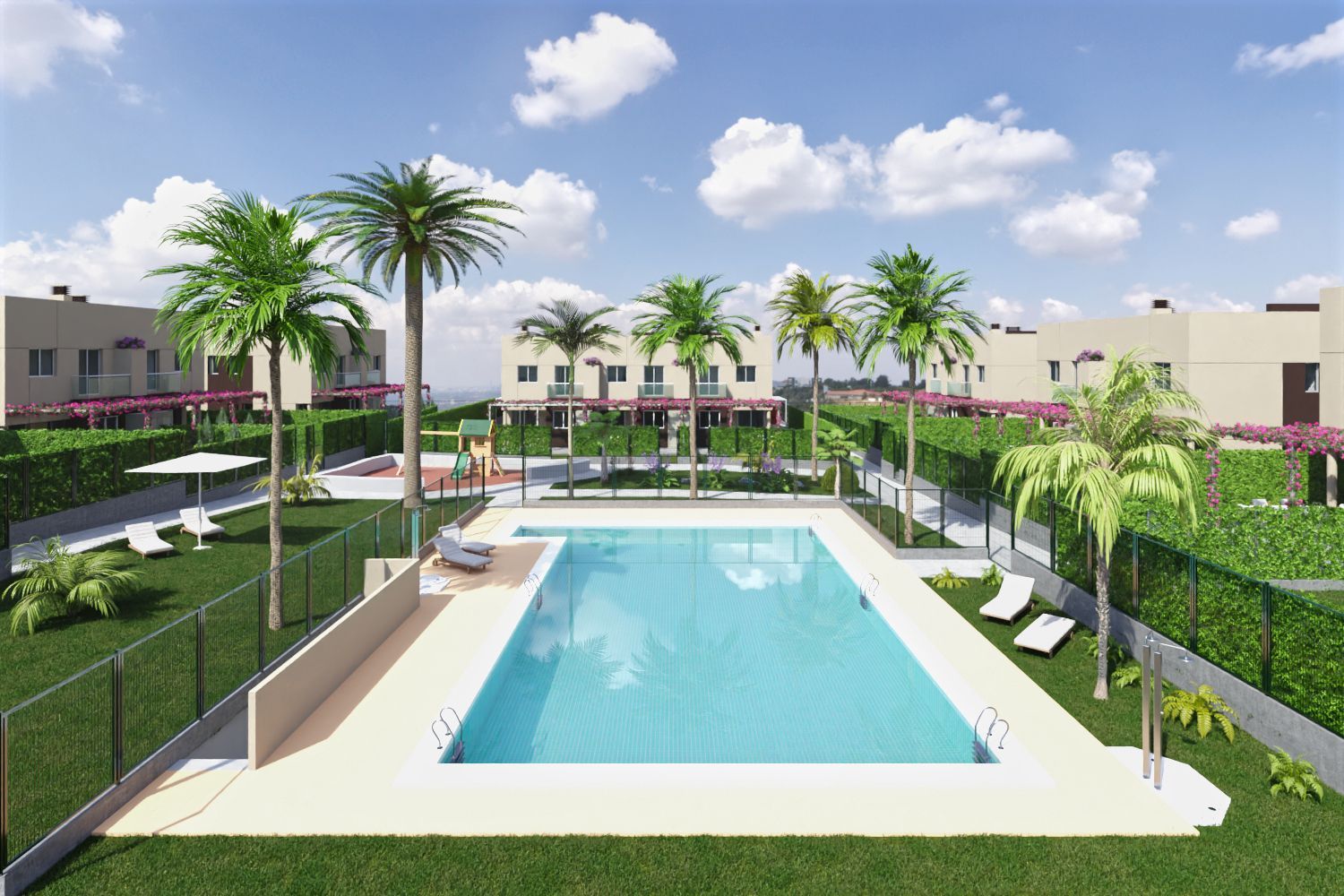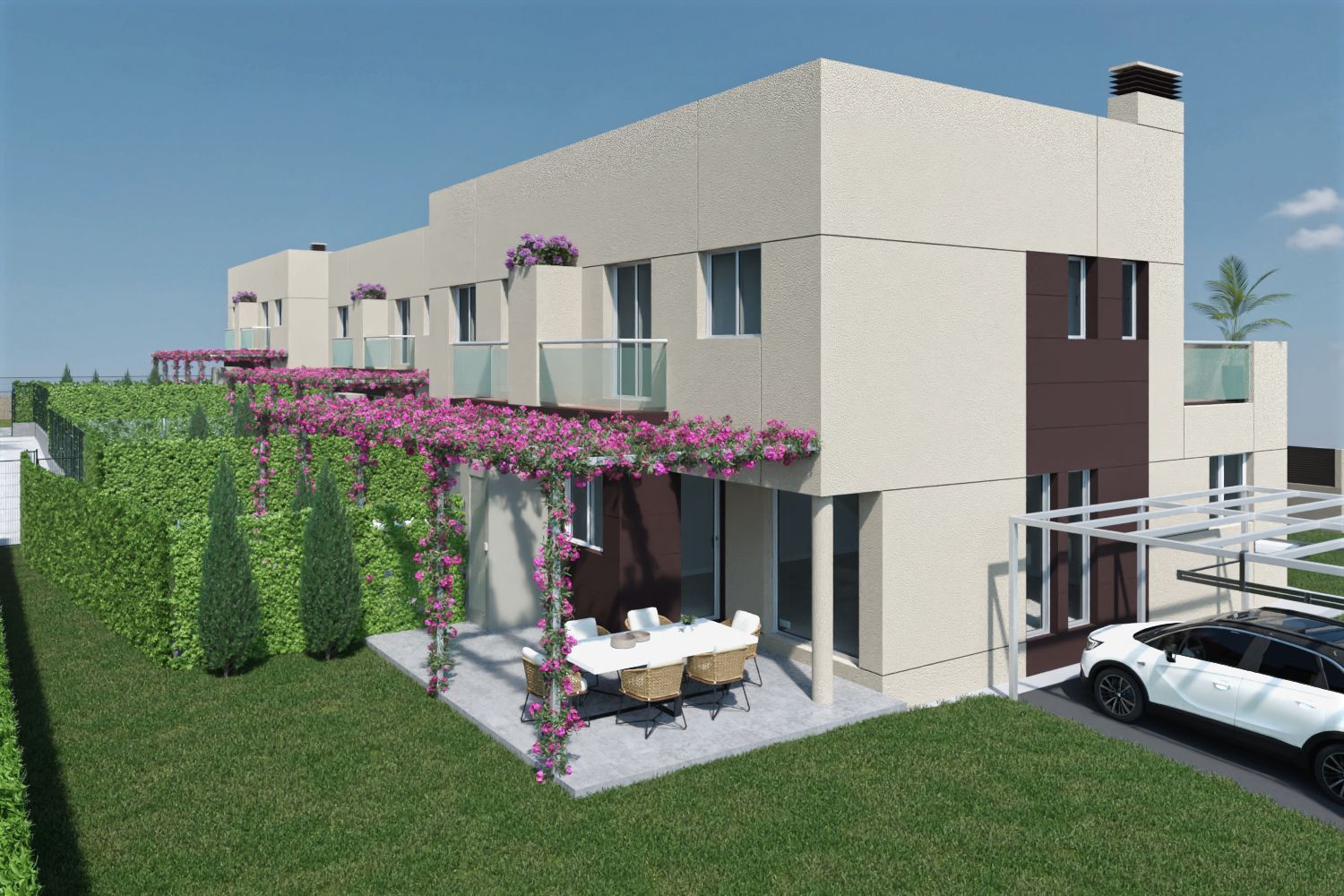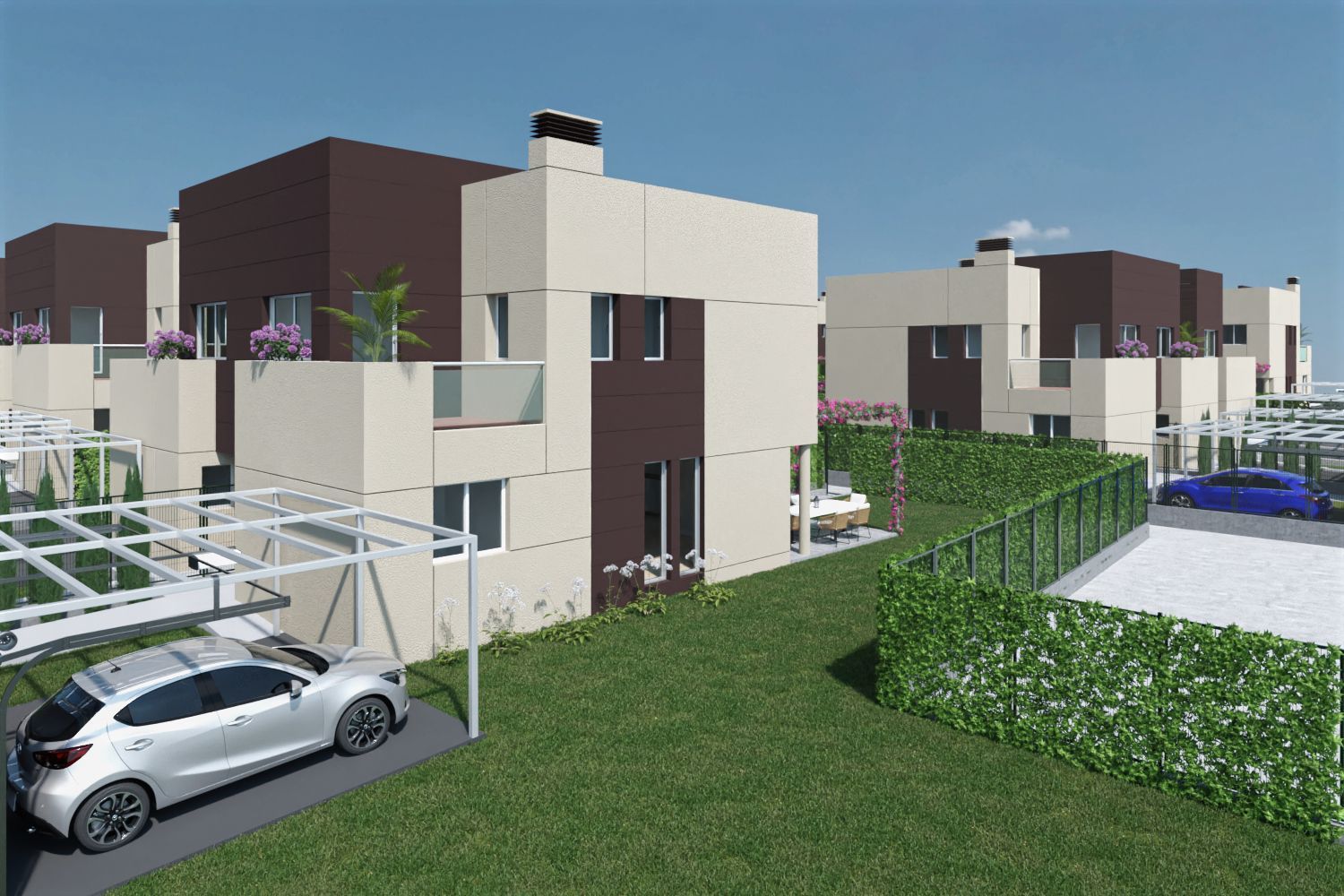 offers an exclusive selection of 15 homes, each thoughtfully designed over two levels. These residences feature spacious living rooms and integrated kitchens, fully furnished, with four bedrooms and three bathrooms, complemented by terraces and generous plots.