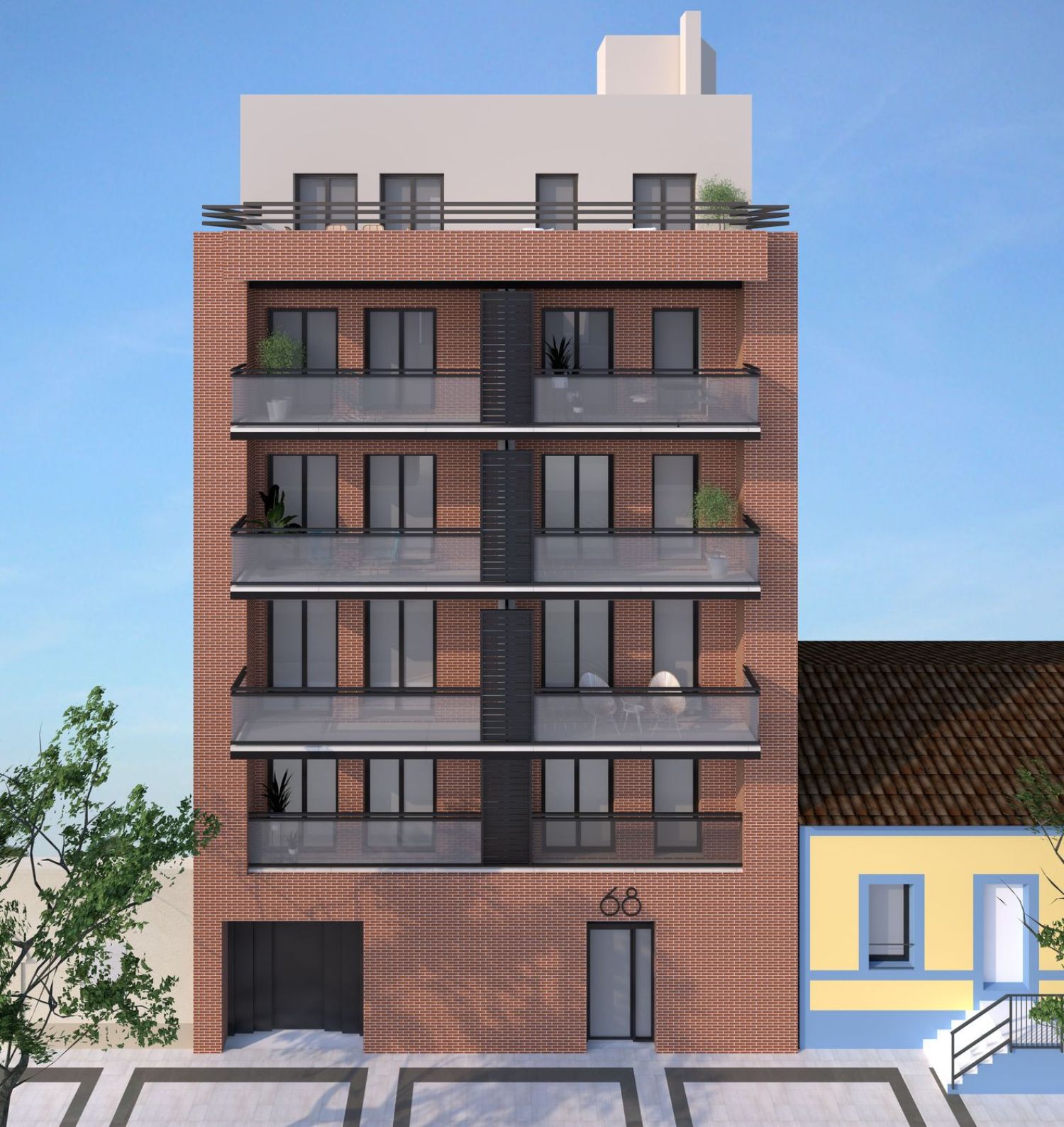 Discover an exceptional new real estate development located on Paseo Ramon y Cajal 68 in the vibrant city of Huesca. This striking building is crafted with distinctive burgundy red facing brick, accentuated by white mortar, and features graphite exterior carpentry, all contributing to a unique façade. The layout of each residence emphasizes abundant natural light and spacious, open areas.