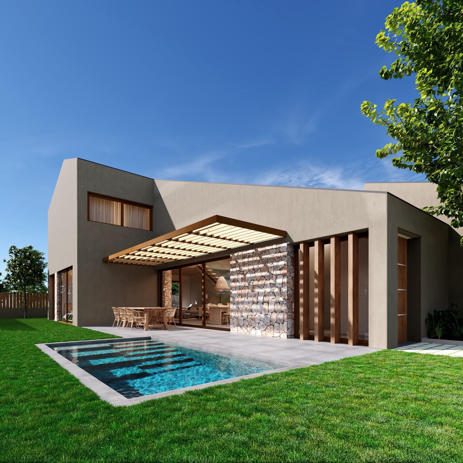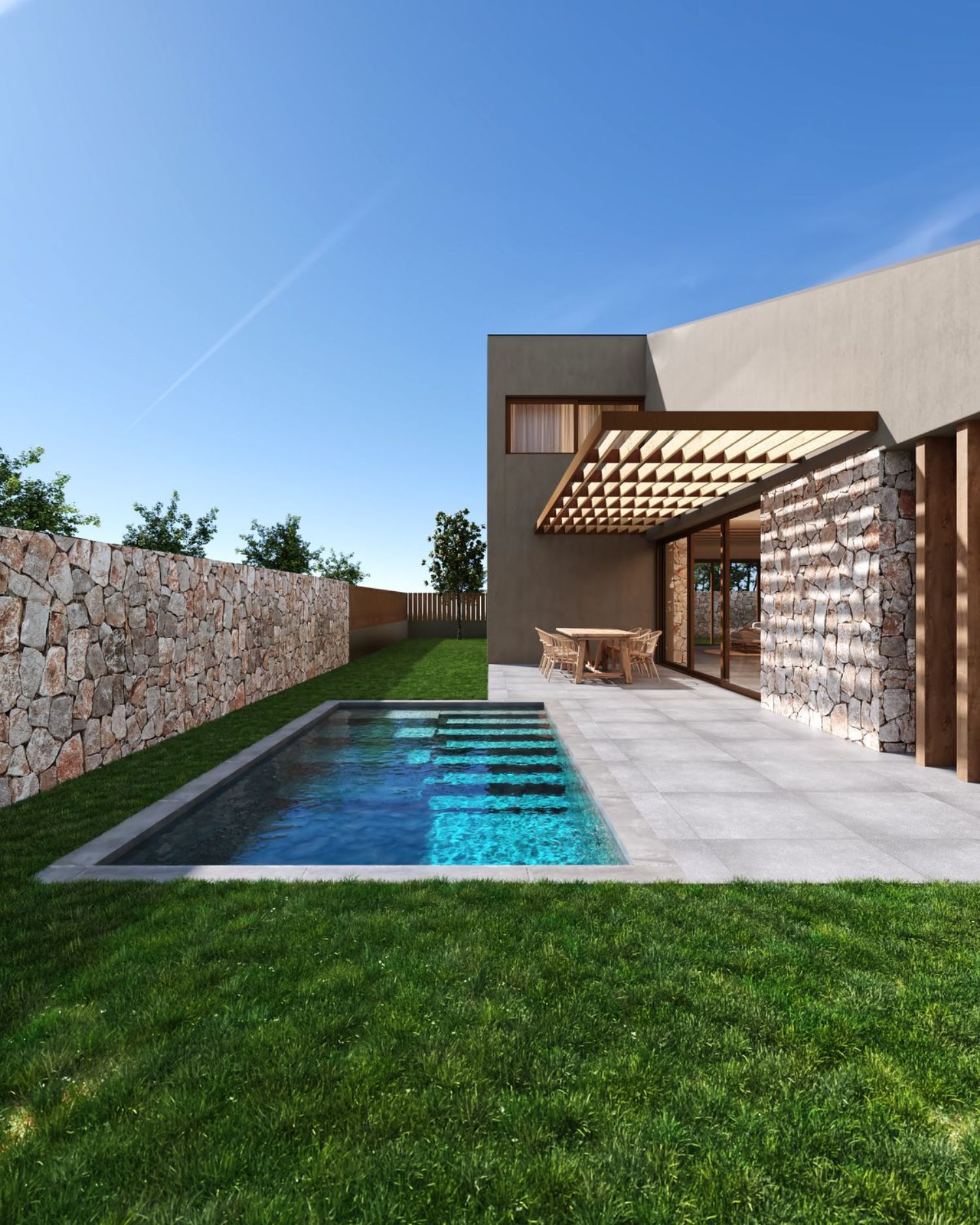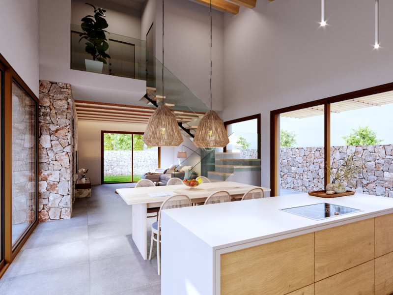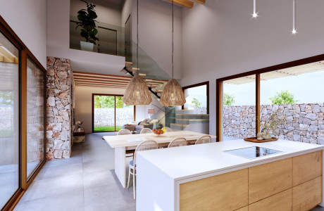 On the upper floor, three additional double bedrooms and a full bathroom are laid out over 55 m². High-quality finishes include an exterior facade of earth-toned cladding and natural stone masonry. The interiors feature porcelain stoneware floors, with the option for AC5 laminate throughout, and a comprehensive heating and cooling system ensuring comfort through Aerothermal technology. This consists of underfloor heating and both exposed and concealed industrial-style air ducts. White matte lacquered doors and skirtings, alongside built-in wardrobes, complete the interiors. Enjoy the lush gardens, inviting pergola, and refreshing pool, creating an unparalleled living experience.