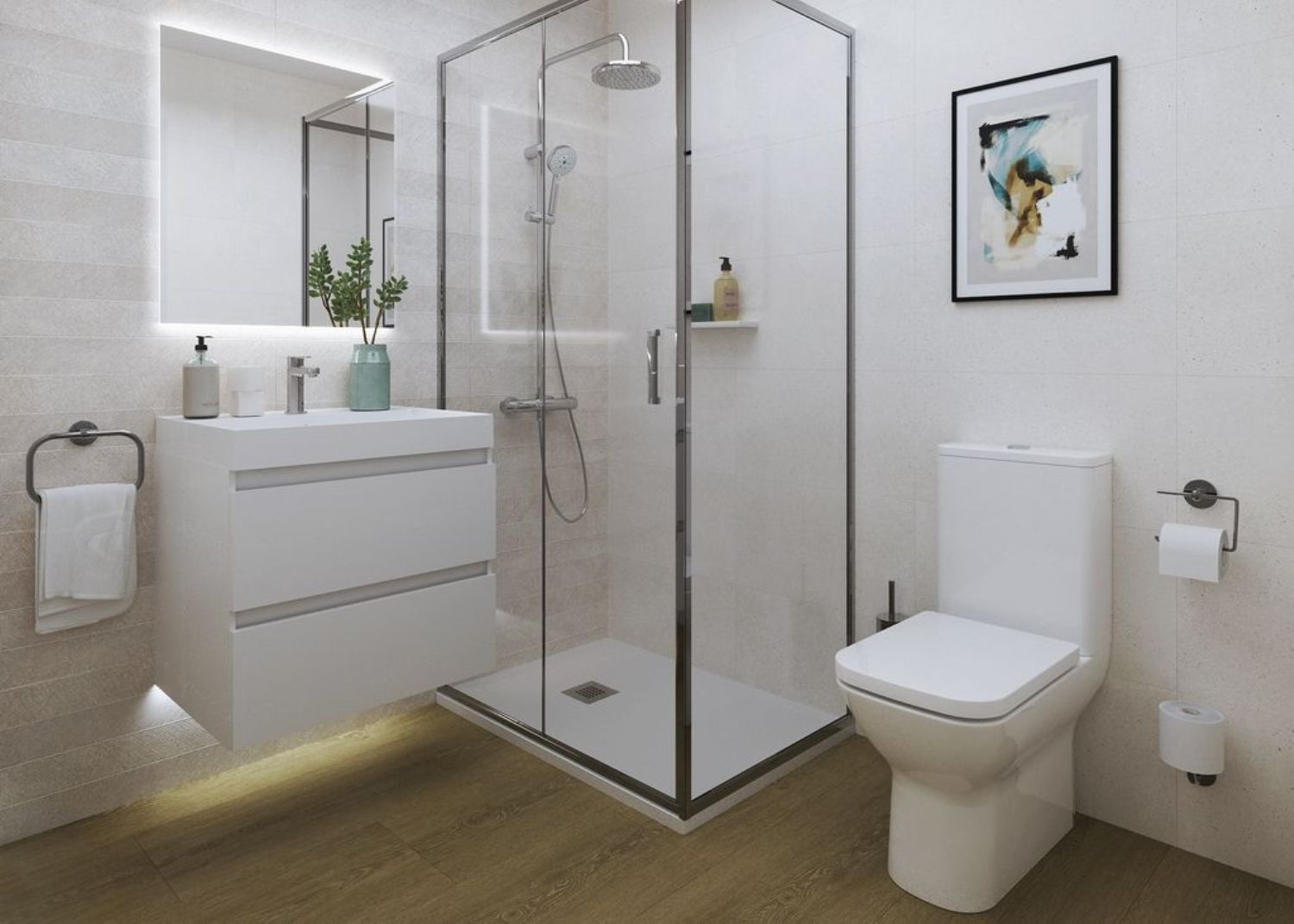 Each apartment is designed with your comfort in mind. The kitchen is fully equipped, featuring top and bottom cabinets, an induction hob, extractor hood, microwave, and a multifunction oven. High-quality laminate flooring and state-of-the-art heated and cooling floors are installed throughout, providing exceptional comfort in every corner of your new home.