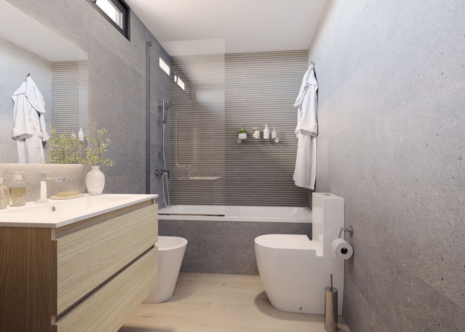Designed with a modern and functional approach, the residence harmoniously integrates into the landscape through its terraced layout, optimizing the site’s potential. It boasts an A energy efficiency rating, featuring an aerothermal heating system, climate-controlled homes with underfloor heating and cooling, and quality finishes from a renowned brand both inside and out. The kitchens come fully furnished, with the option for buyers to personalize finishes to their taste.