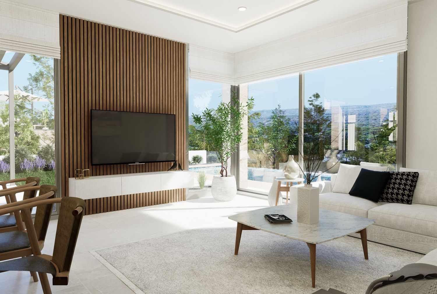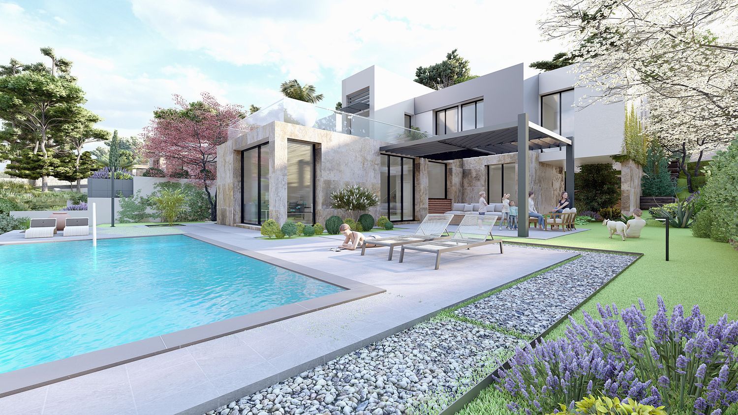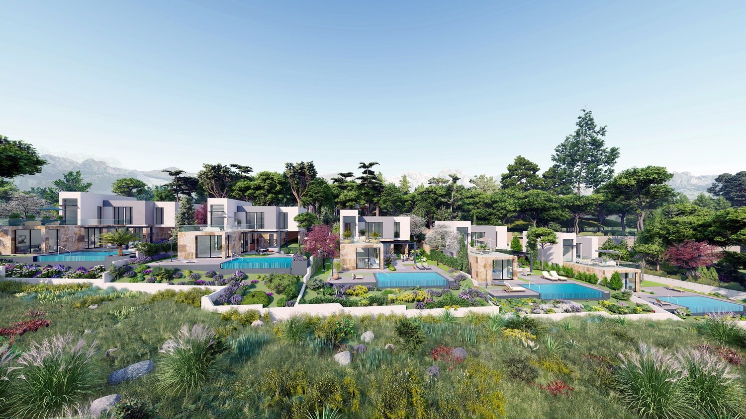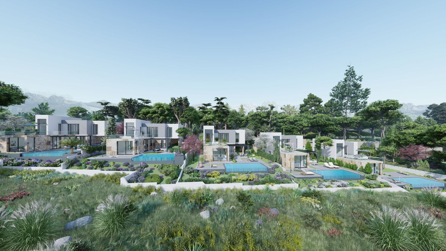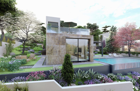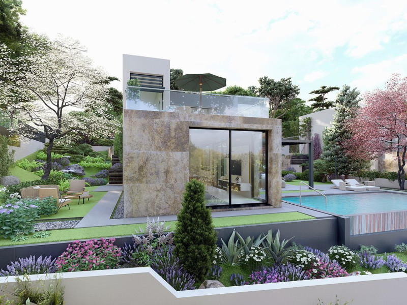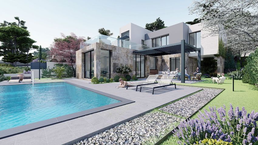 Each stand-alone villa offers a unique design that can be tailored to suit your preferences. The development features five independent homes, each with 325 m² of living space situated on plots measuring 647 m². These homes are designed to maximize natural light throughout spacious interiors.