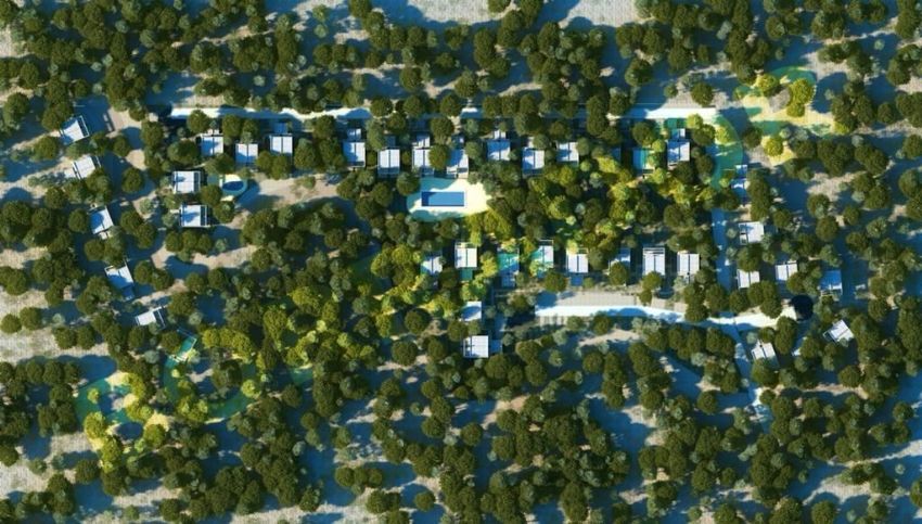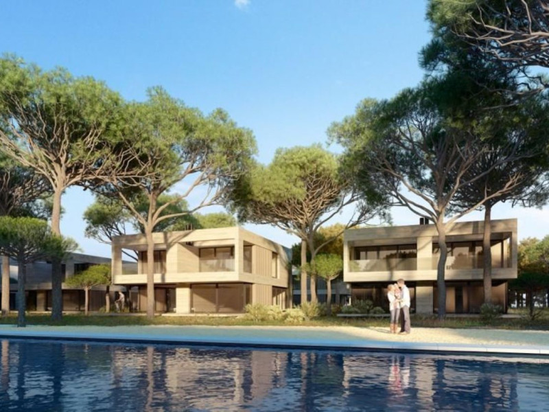 The main living space boasts a striking glass staircase leading to the upper floor, where you'll find three additional bedrooms. One of these bedrooms has an en-suite bathroom and a terrace, while the other two share a third bathroom. Beyond the private garden of each home, residents can enjoy a 21,000 square meter communal area, which highlights a swimming pool, an inviting yoga space, and an outdoor functional training gym. The garden design respects the natural beauty of the pine forest, allowing native vegetation to flourish.
