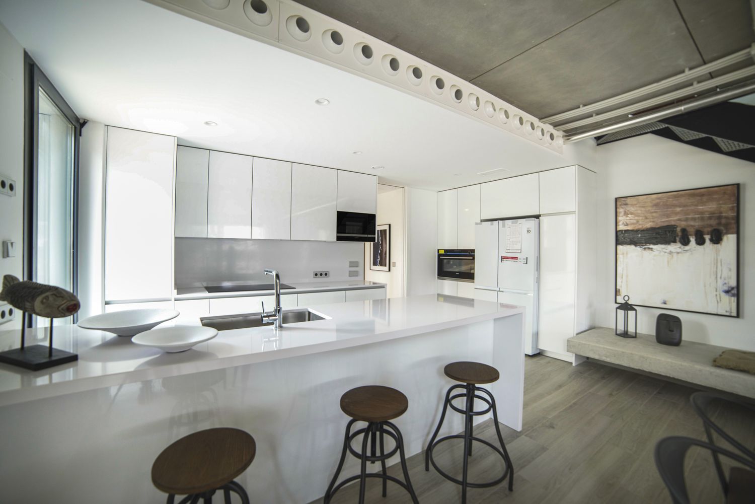 Each house is decorated with an industrial aesthetic crafted by an interior design firm, ensuring a unique finish and superior quality compared to other homes. Every room, including the bathrooms, is bathed in natural light and equipped with proper ventilation, enhancing comfort throughout the home. Additionally, two garage spaces are provided, although the furnishings are not included in the purchase.