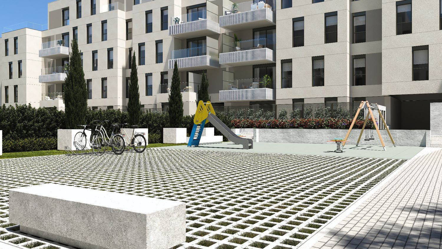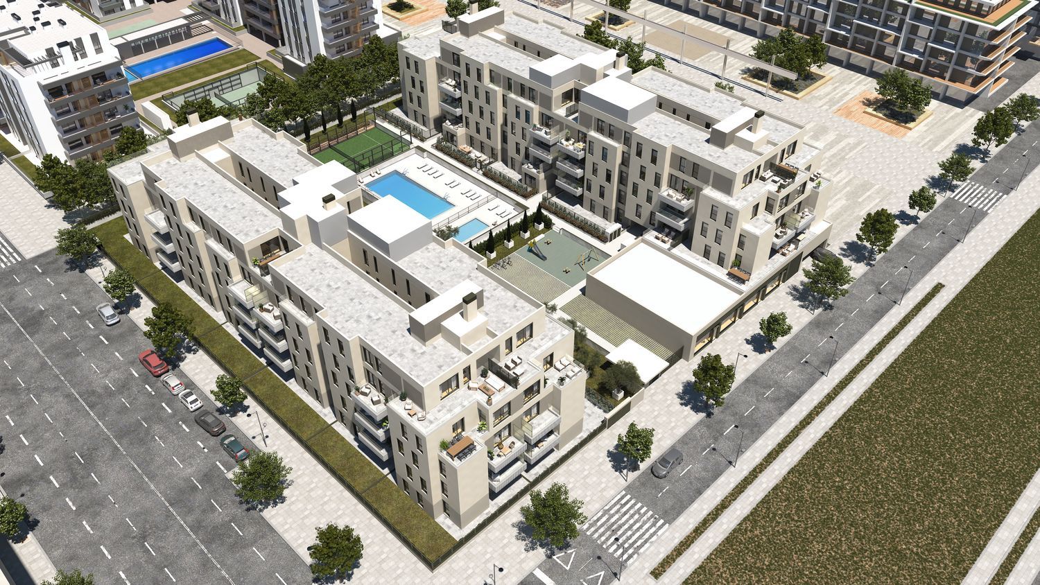 Residents will have access to beautifully landscaped areas, a swimming pool for both adults and children, and facilities for paddle tennis. Additionally, there is a solarium area, perfect for relaxation and leisure. This dynamic project offers a blend of modern living with a focus on comfort and sustainability, all located in the vibrant city of Alcalá de Henares.