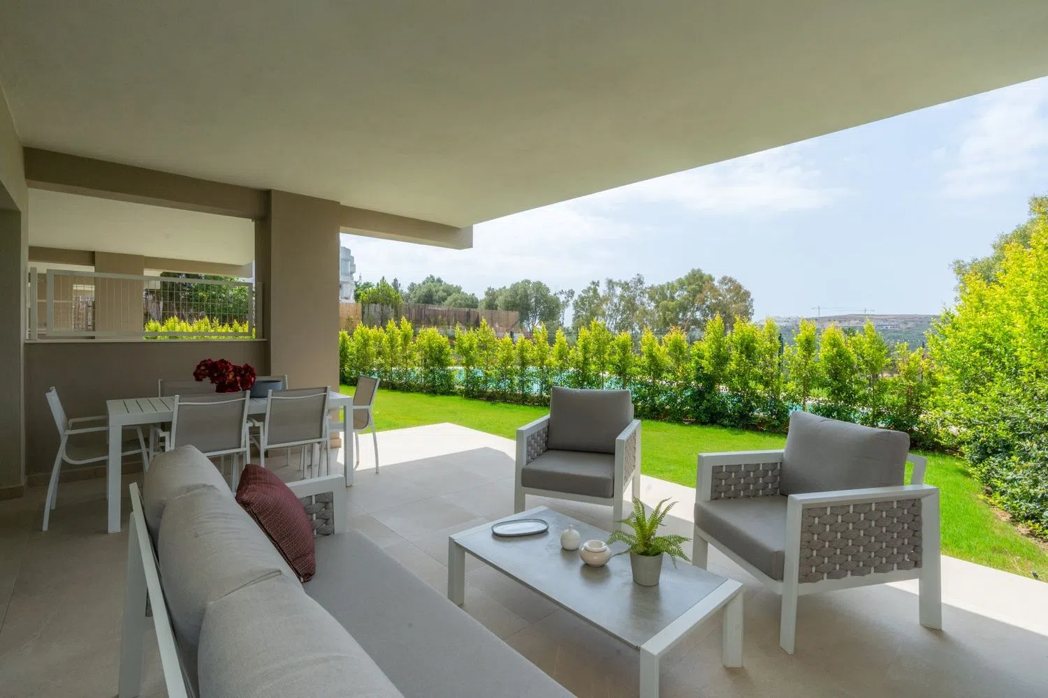 The apartments feature expansive terraces, with ground floors boasting private gardens and penthouses offering private terraces and a solarium. This secure and private community includes beautifully landscaped gardens and a communal pool. Known for its superior construction quality, the development uses new luxury materials and high-end finishes. The properties are designed with open-plan kitchens integrated into the living areas, fitted with state-of-the-art ceramic tiles, ovens, and refrigerators. Additionally, the bathrooms are fully equipped, with shower screens and mirrors included.