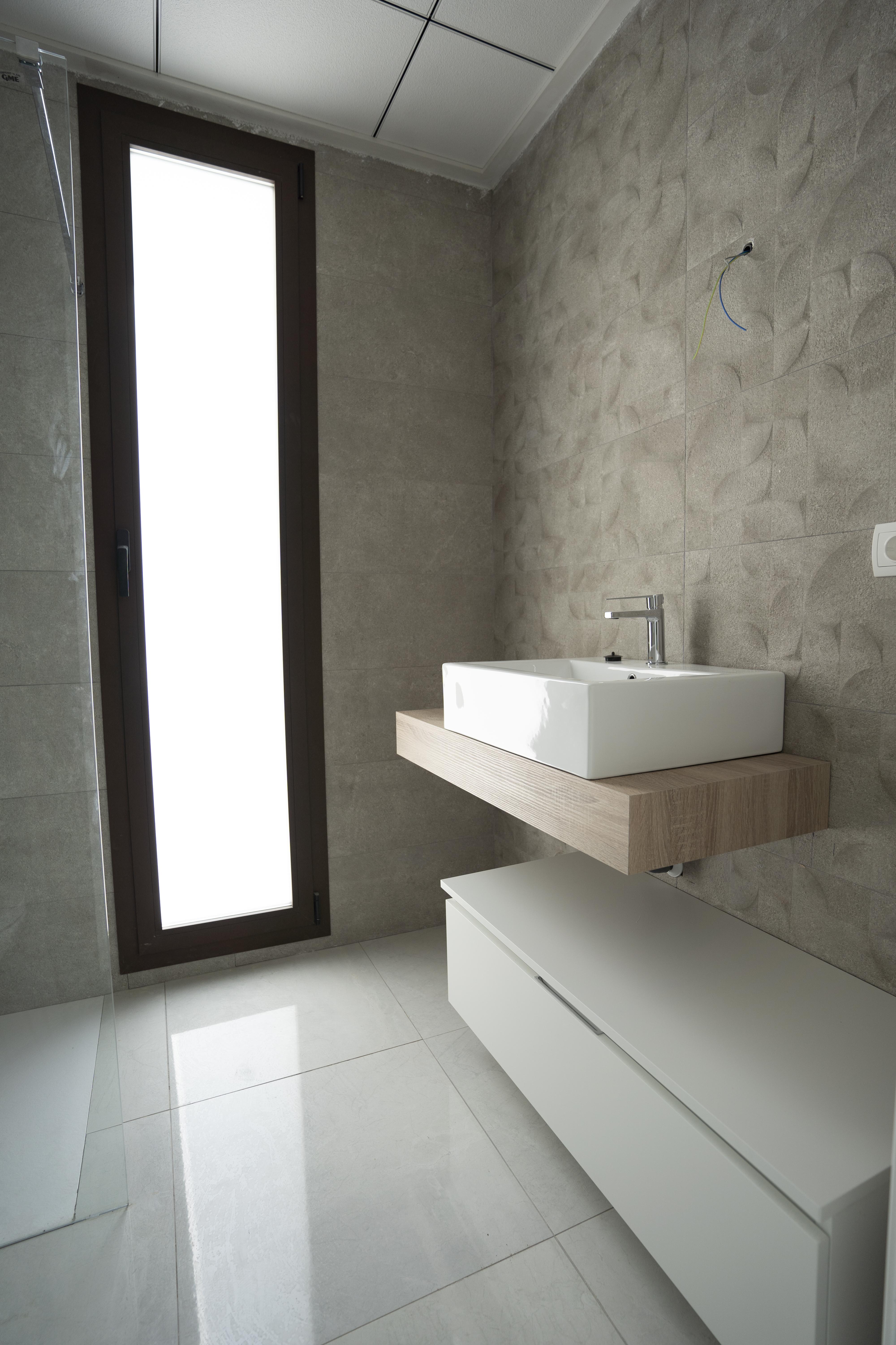 - Baño 1: Revestimiento porcelánico ICON 30x90 (Shape Icon Grey o similar).