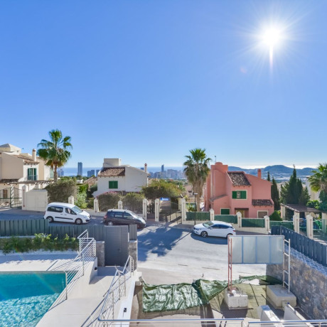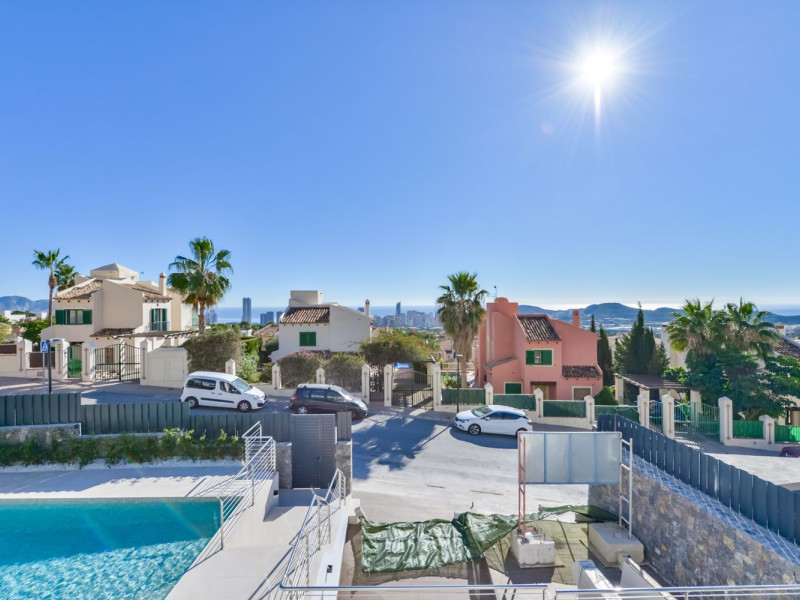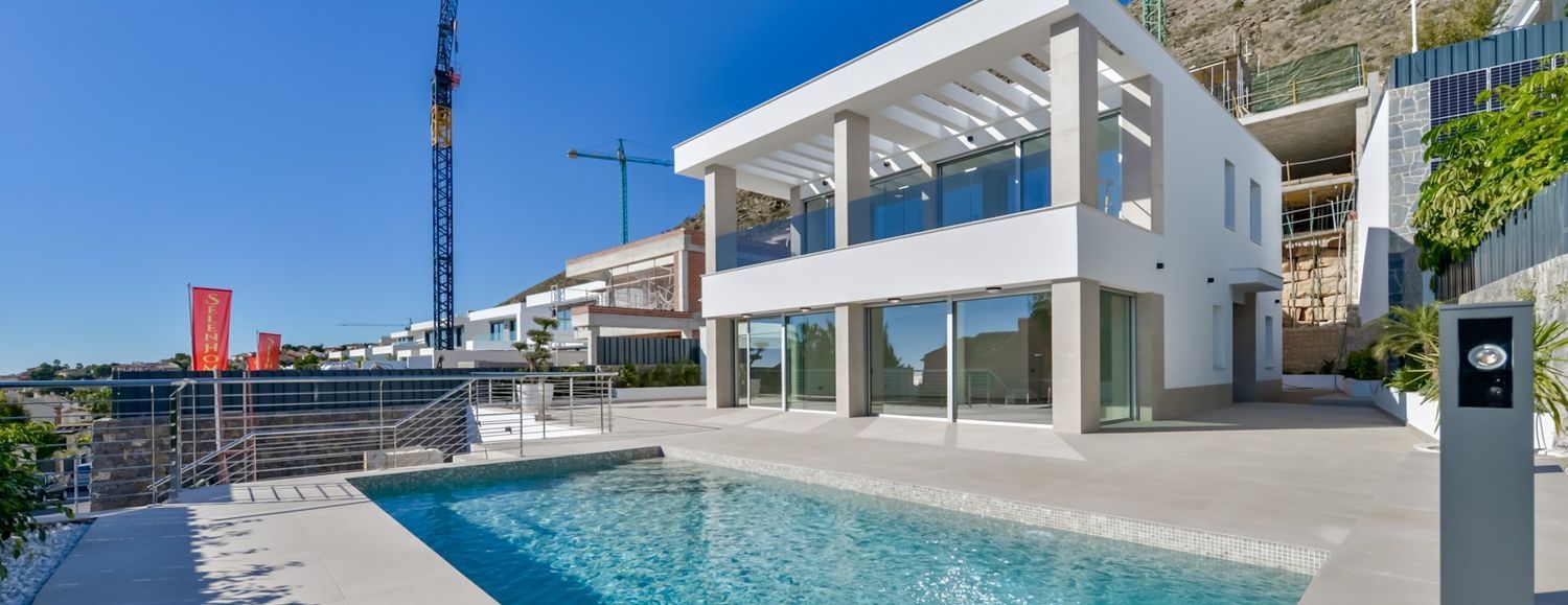 Discover the newly completed villa in the sought-after Sierra Cortina region of Finestrat. This standalone villa offers unparalleled sea and mountain views in one of the most luxurious areas of the Costa Blanca, just a short five-minute drive from a bustling coastal city. Enjoy the exclusivity of a Michelin-starred restaurant and sports facilities only two minutes away. The villa provides a breathtaking panoramic view over La Marina Baixa bay, set against a stunning mountain backdrop. The ground floor features a spacious ceiling height of 2.85 meters, mirrored on the second floor. The villa boasts a constructed area of 634 square meters and sits on a 704 square meter plot.