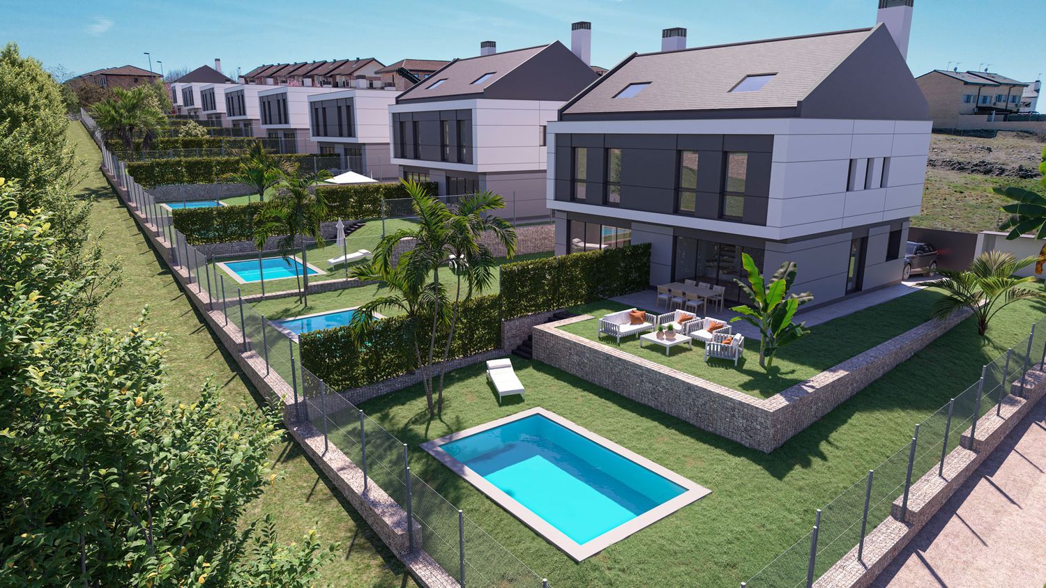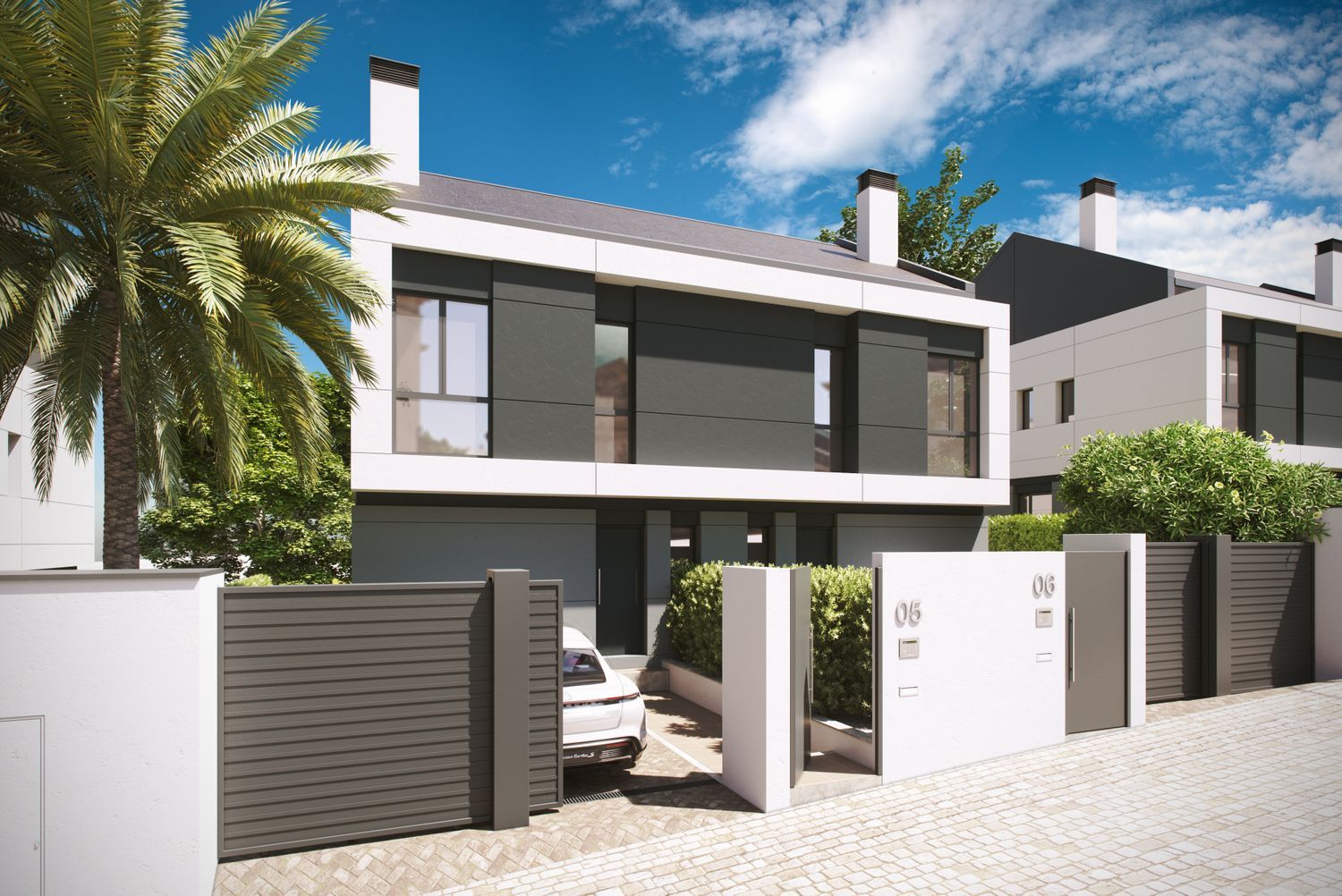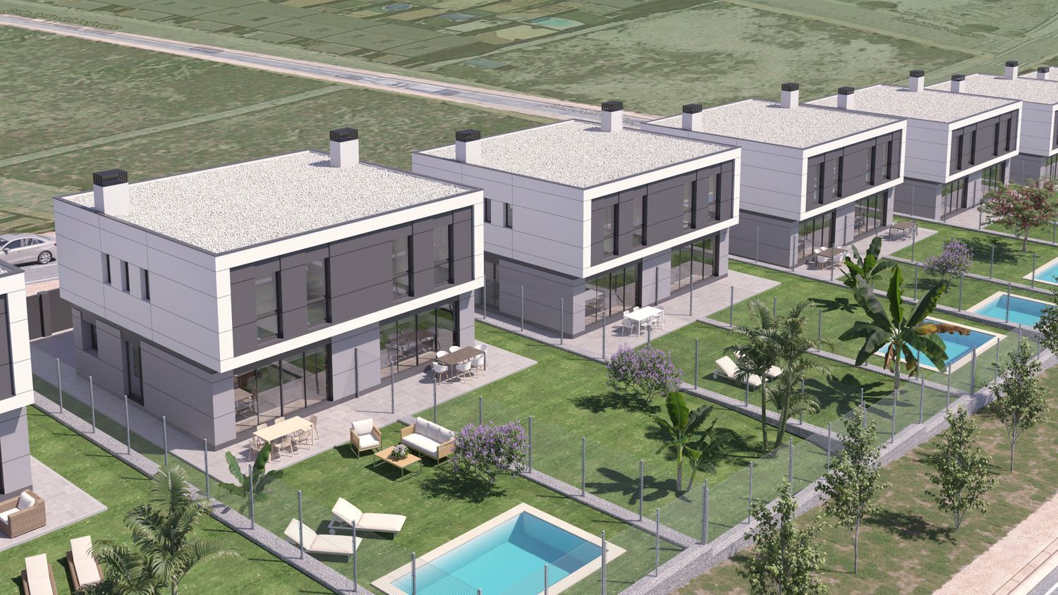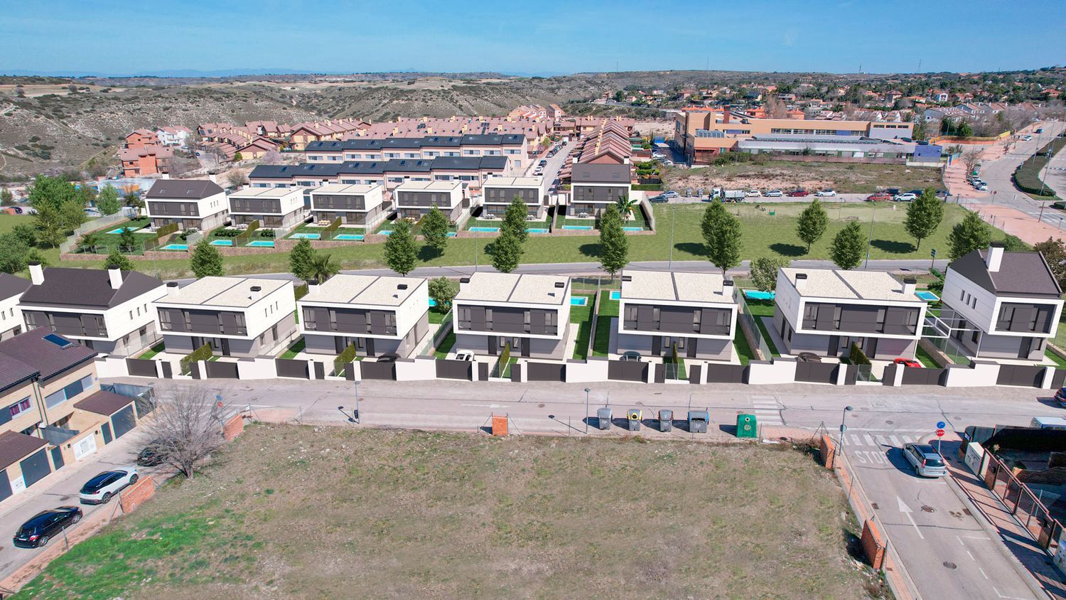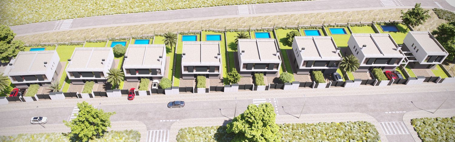 Construction is already underway for a remarkable new development featuring 27 semi-detached homes, each on an individual plot of more than 500 square meters. These residences are thoughtfully designed across two levels, with the option to add a third lofted floor. They boast a private front courtyard, ample parking space for two large vehicles, expansive side and rear gardens, and the possibility of installing a private pool.