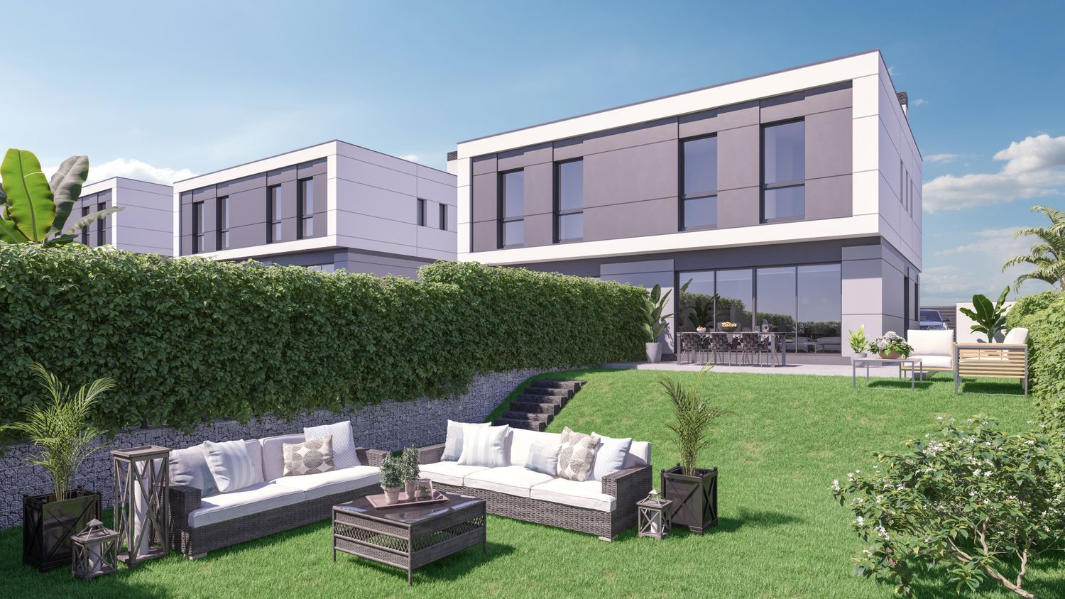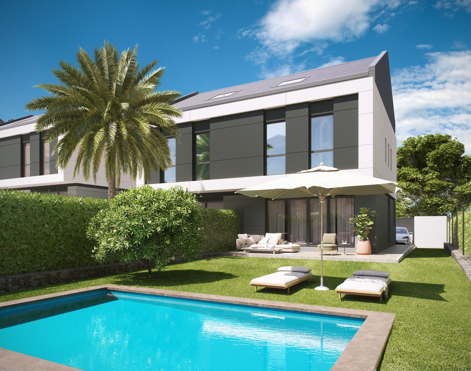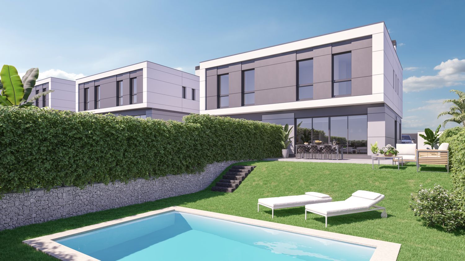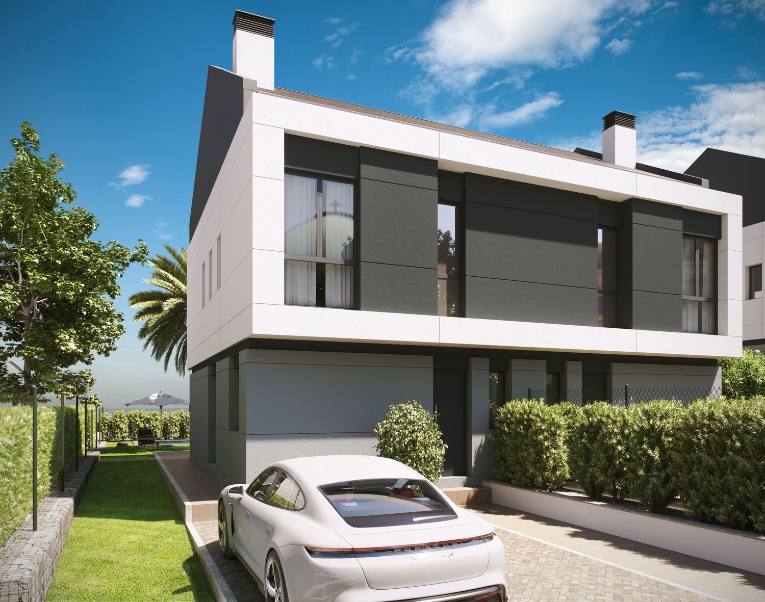 Construction is already underway for a remarkable new development featuring 27 semi-detached homes, each on an individual plot of more than 500 square meters. These residences are thoughtfully designed across two levels, with the option to add a third lofted floor. They boast a private front courtyard, ample parking space for two large vehicles, expansive side and rear gardens, and the possibility of installing a private pool.