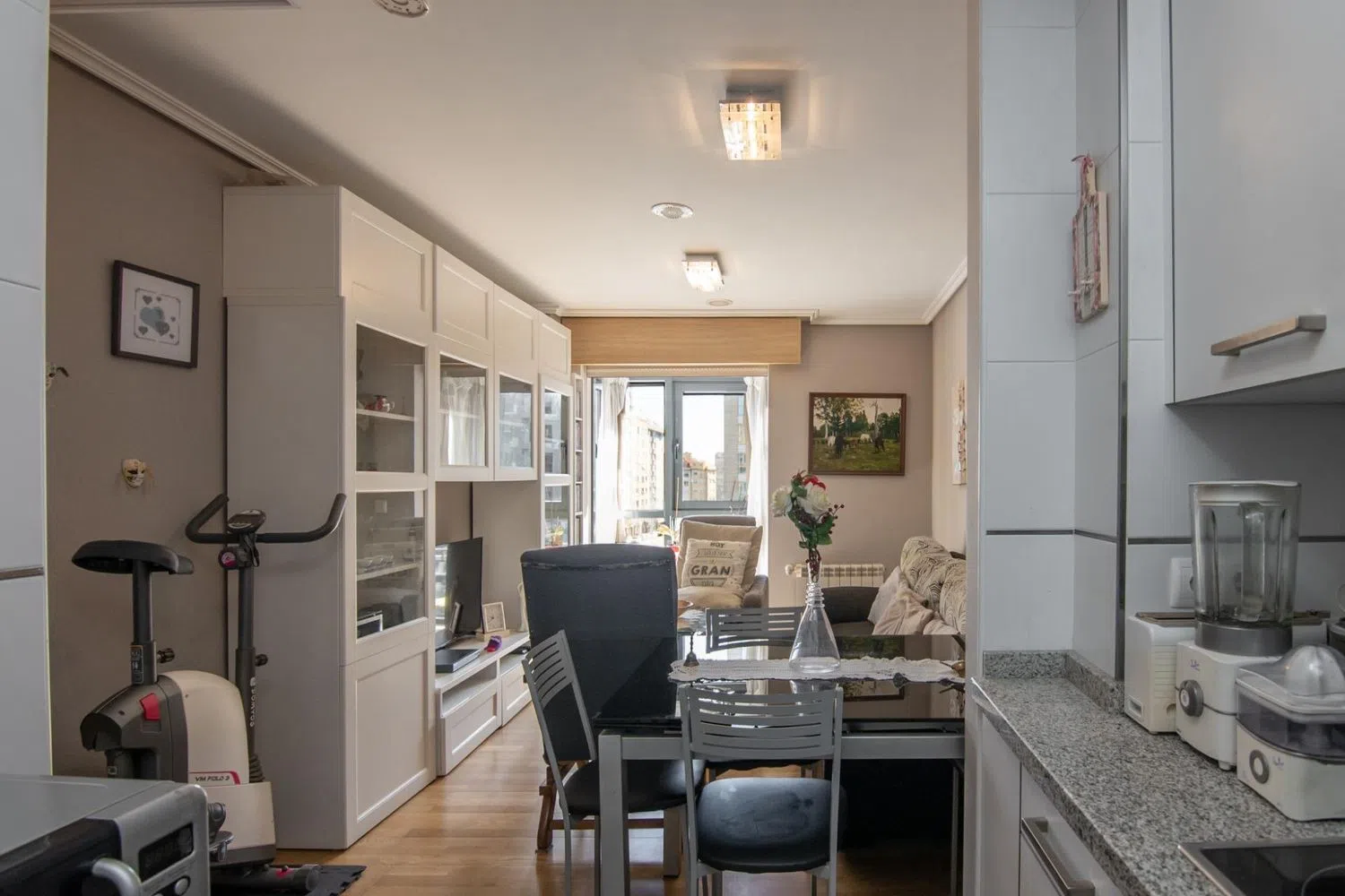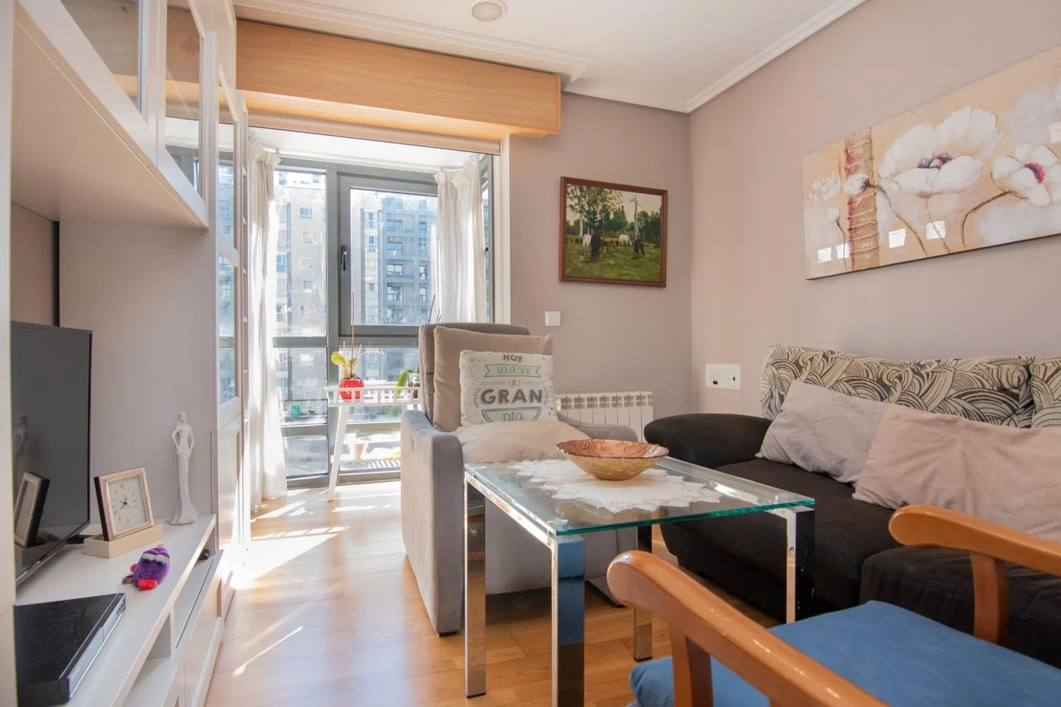 Piso en el conjunto de viviendas del nuevo parque de Vioño, una zona de verde de cerca de 40 mil metros cuadrados, con parque infantil y zonas deportivas, y rodeada de todos los servicios, muy a mano. A su entrada encontramos el salón, con la cocina integrada, y una galería hacia la calle, que le provee de mucha claridad. La zona de noche se compone de dos habitaciones, con sus respectivos armarios empotrados, y el cuarto de baño, con una cabina de ducha. Desde el baño se accede a un lavadero-tendedero, con la caldera de gas. Trastero en la entreplanta, de unos 4 metros cuadrados.