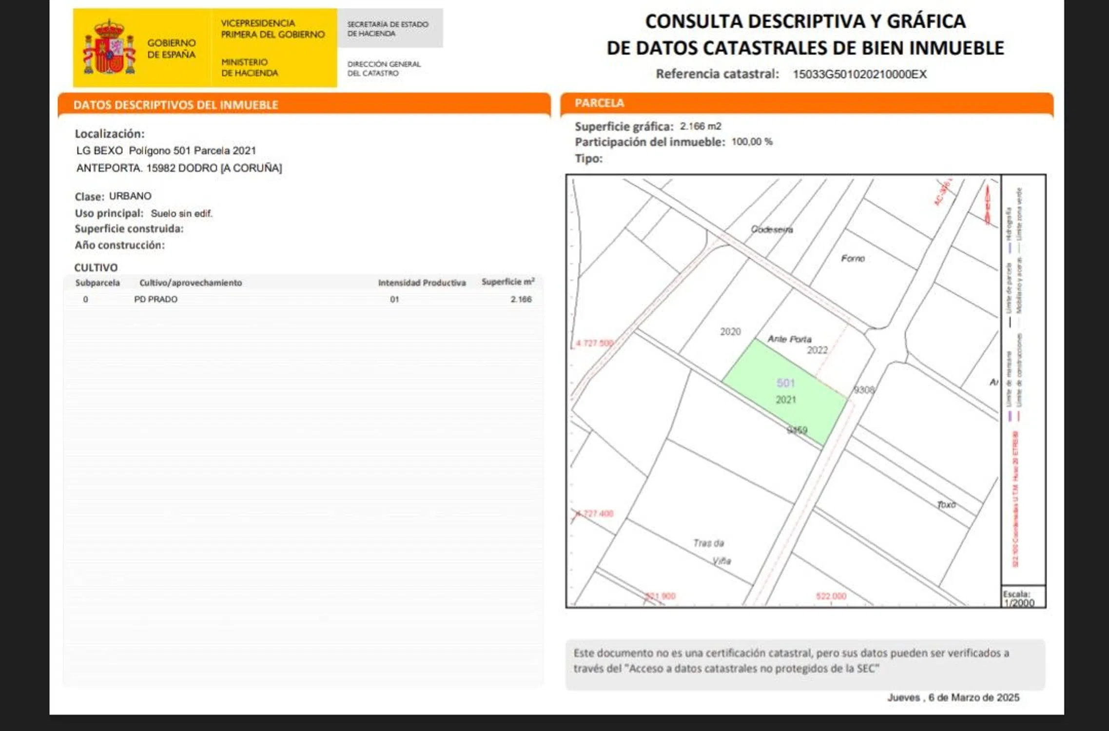Parcela urbana de 2300m2, de forma rectangular. Totalmente limpia y libre de arbolado, con visibilidad al valle del bajo rio Ulla divisando unos 20km de su cauce y del que la separa unos 450m. Parcela que se encuentra a unos 40m sobre el nivel del propio rio. EDIFICACION: Calificada como suelo de nucleo rural no tiene ninguna limitacion de edificabilidad para una o mas viviendas por superficie. UBICACION: Situada a 300m del cruce con la carretera comarcal C-305 de Padron a Ribeira, y entrada y salida a la autovia del Barbanza en el propio lugar de Bexo. Poblaciones mas cercanas son, Padron y Rianxo 10km, Boiro 18km y Santiago a 30km aprox.