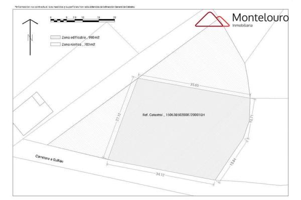 Finca urbanizable en Gulfián, a solo 2km de la Playa de Broña. Este magnífico terreno urbanizable de 1.606 m² te ofrece un espacio amplio y versátil, con 990 m² de suelo edificable para diseñar la casa de tus sueños. Situado a solo 2 km de la hermosa Playa de Broña, disfrutarás de un entorno natural privilegiado y de un clima soleado y despejado. Además, su ubicación estratégica te permite llegar a Santiago de Compostela en tan solo 25 minutos. La parcela cuenta con una configuración regular, lo que te brinda la posibilidad de crear un diseño arquitectónico único y aprovechar al máximo las vistas del entorno. Con acceso a vía urbana a tu disposición, este terreno se presenta como una opción muy atractiva en el mercado actual. No pierdas la oportunidad de invertir en una zona en crecimiento, ideal para construir una residencia unifamiliar o chalet en un núcleo urbano en expansión. ¡Ven y descubre el potencial de este terreno excepcional!