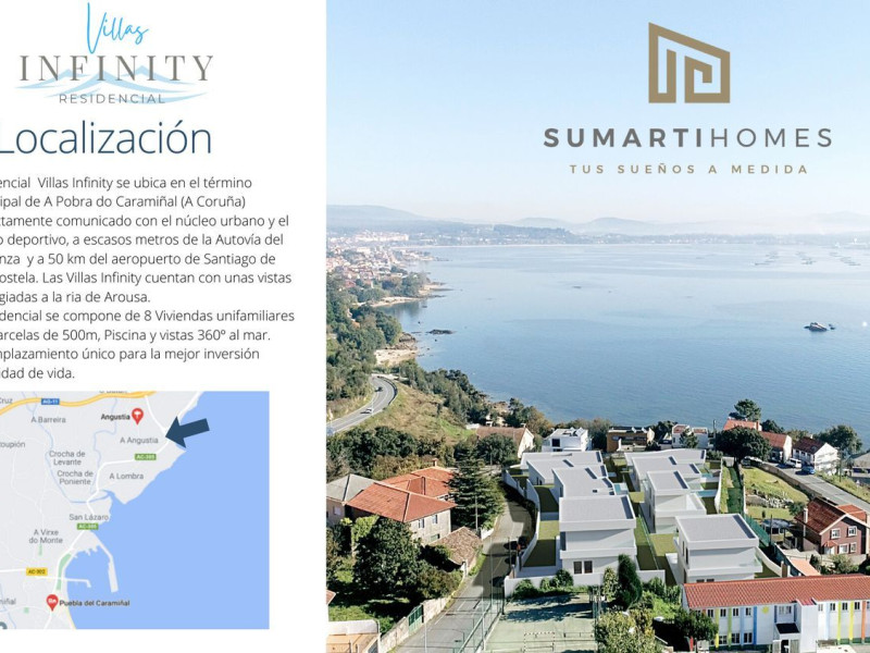 Residencial Villas Infinity se ubica en el término municipal de A Pobra do Caramiñal (A Coruña) perfectamente comunicado con el núcleo urbano y el puerto deportivo, a escasos metros de la Autovía del Barbanza y a 50 km del aeropuerto de Santiago de Compostela. Las Villas Infinity cuentan con unas vistas privilegiadas a la ria de Arousa.El residencial se compone de 8 Viviendas unifamiliares con parcelas de 500m, Piscina y vistas 360º al mar.Un emplazamiento único para la mejor inversión en calidad de vida.