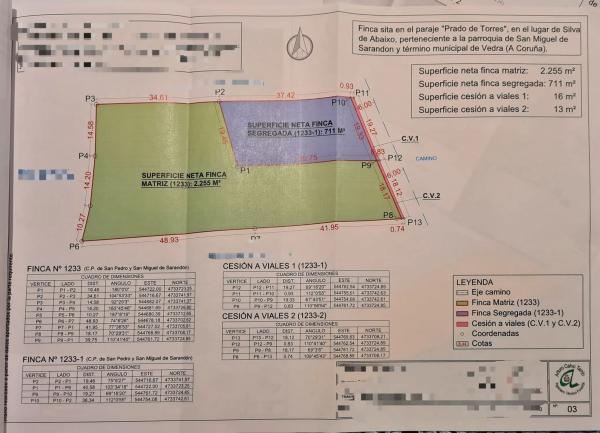 Finca edificable y llana de 2.995 m2 en "Prado de Torres, Lugar de Silva de Abaixo, Sarandón, Vedra" a 20 minutos del centro de Santiago, a 5 minutos de Lestedo y a 3 minutos de las AP-53. Se vende entera o ya segregada: (mirar planos, segregación y cesión viales) Metros netos: 2.966m2. (60.000€) Segregada: 711 m2 = 25.000 € y 2.255 m2 = 40.000 €. Precios negociables en función al interés. Edificables 450 m2 en cada una de las parcelas segregadas en la parte próxima a la calzada. Mitad al fondo rústico.