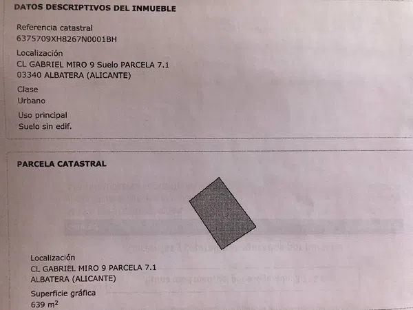Venta de 639 metros cuadrados de solar urbano, con los gastos urbanización pagados y preparado para construir hasta 3 alturas, bajo y sótano. Situado en el municipio de Albatera en la calle Gabriel Miró. A 20 min de la playa de Torrevieja y a 15 min del aeropuerto. Más información por teléfono. Terreno preparado para construir tanto utilizando la parcela completa como separando o segregando por parcelas más pequeñas. Precio negociable según metros y situación de la parcela. Con posibilidad de Alquiler con opción de compra.