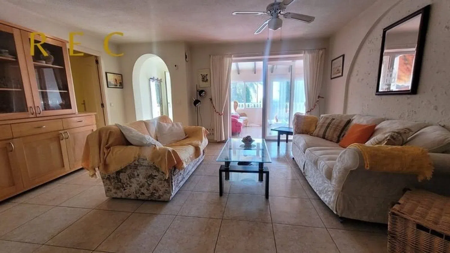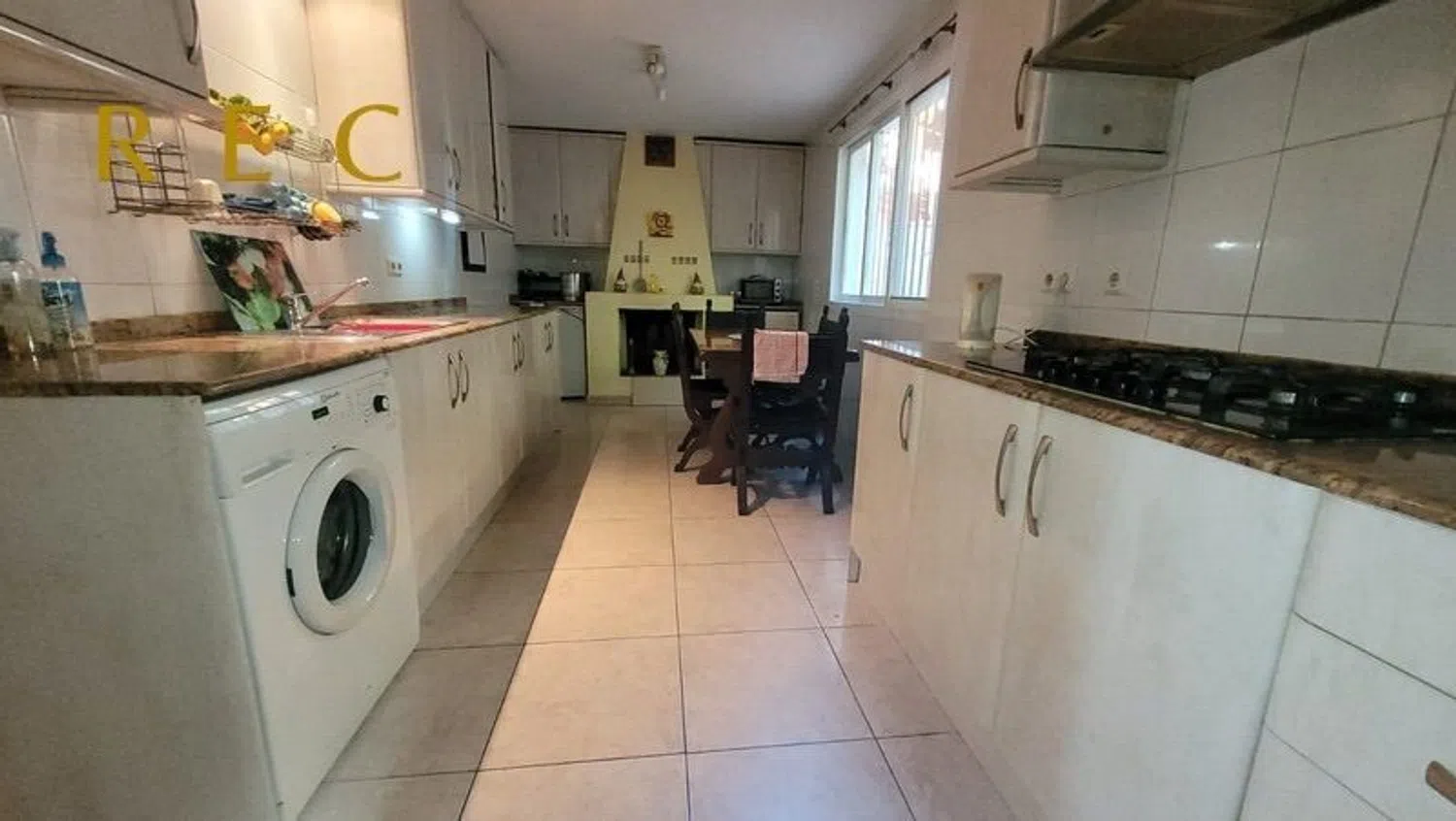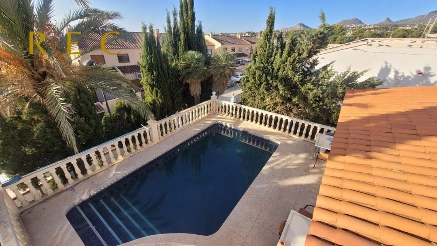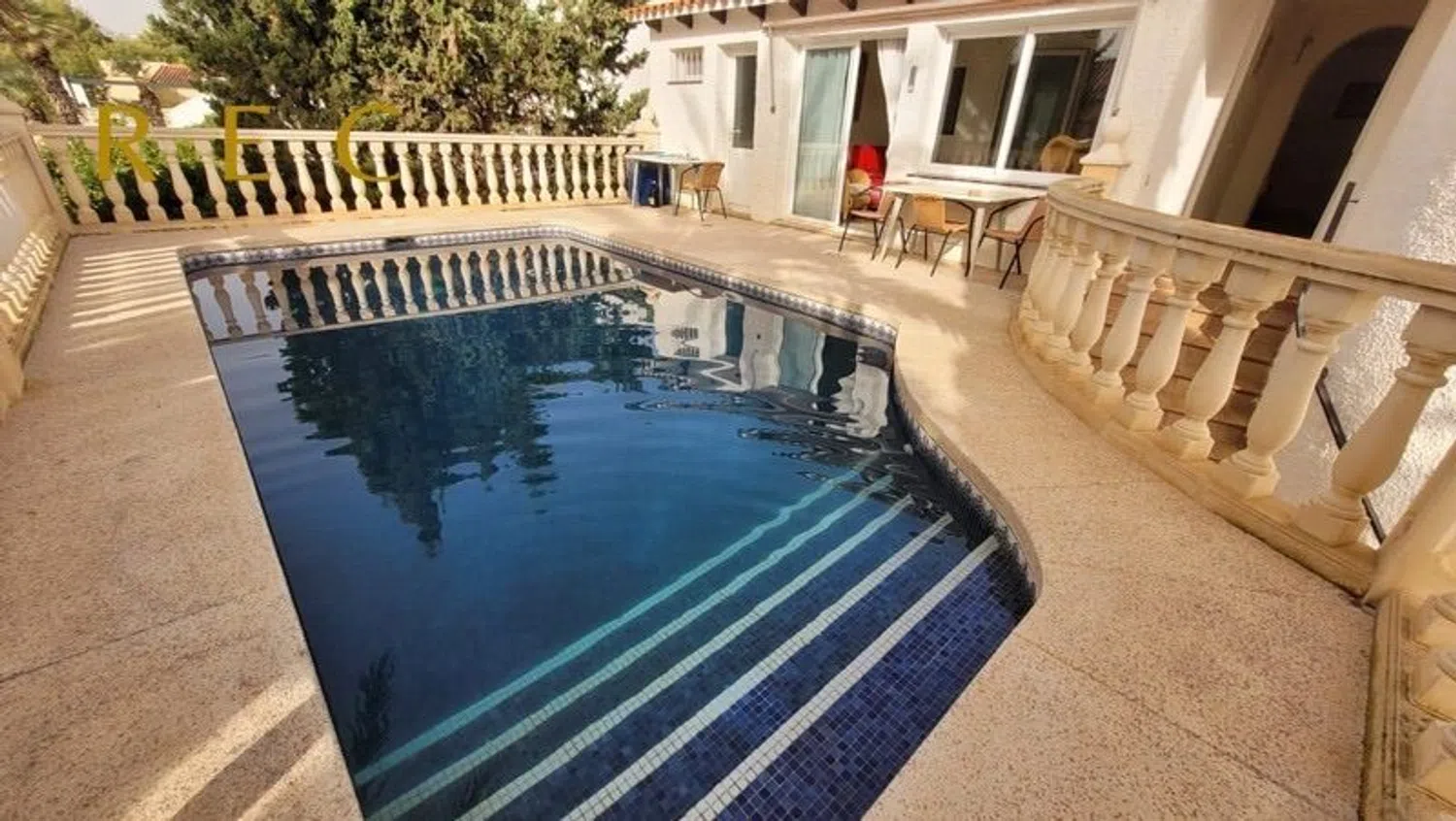 The villa boasts a smart layout featuring five spacious bedrooms, three of which come with en-suite bathrooms, plus an additional family bathroom equipped with a bathtub, making it perfect for larger families or those in need of extra space. The expansive living and dining area features a cozy fireplace and connects seamlessly to a glass-enclosed terrace, allowing for unobstructed views and direct access to the private pool.
