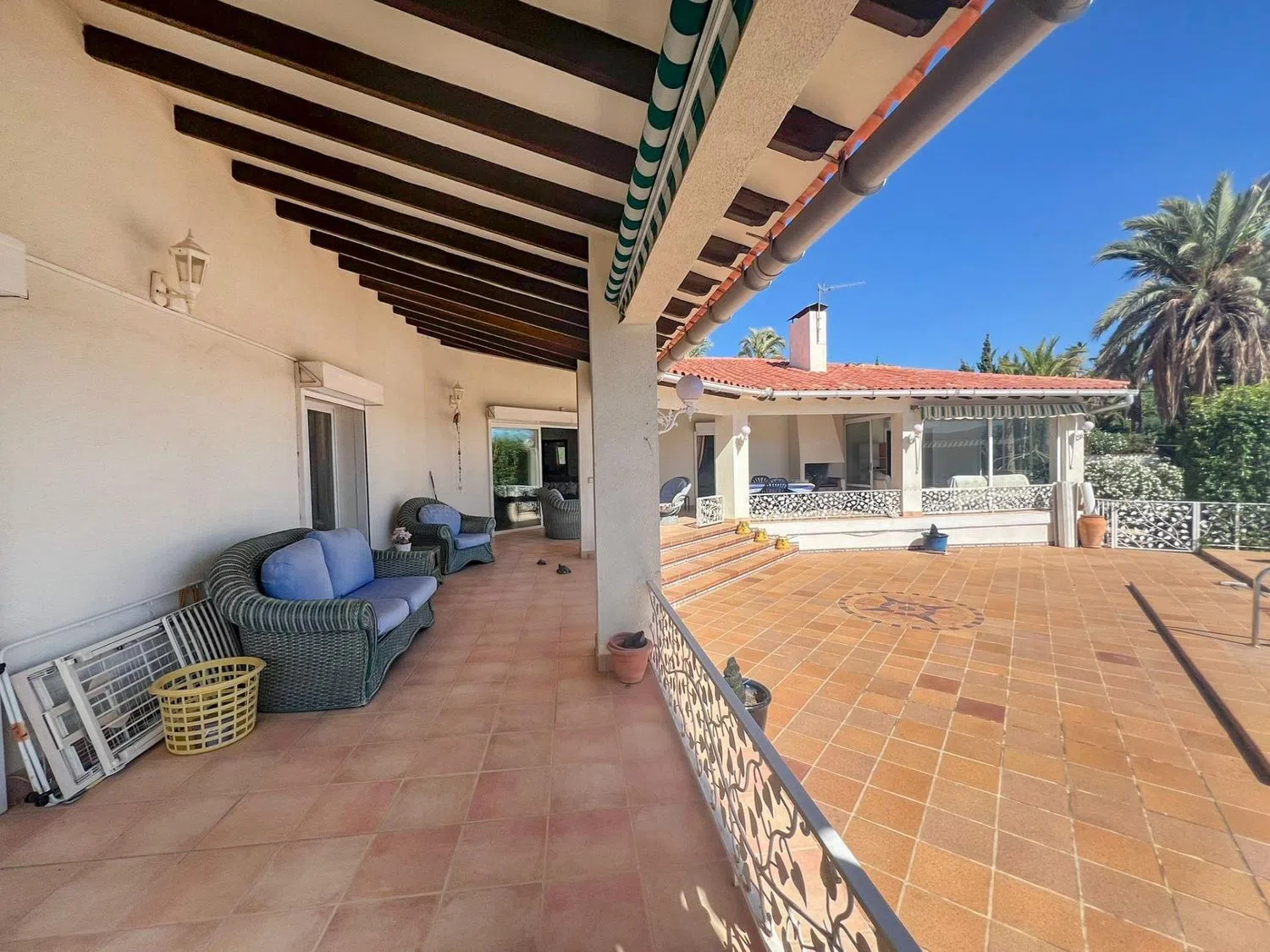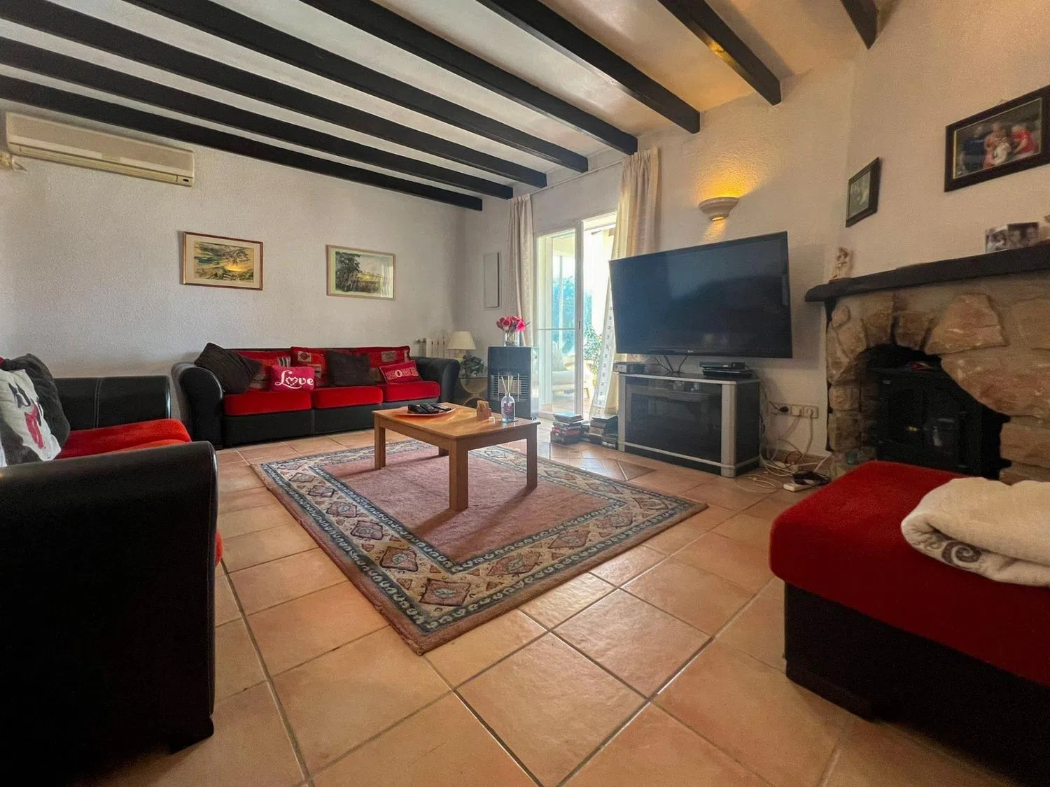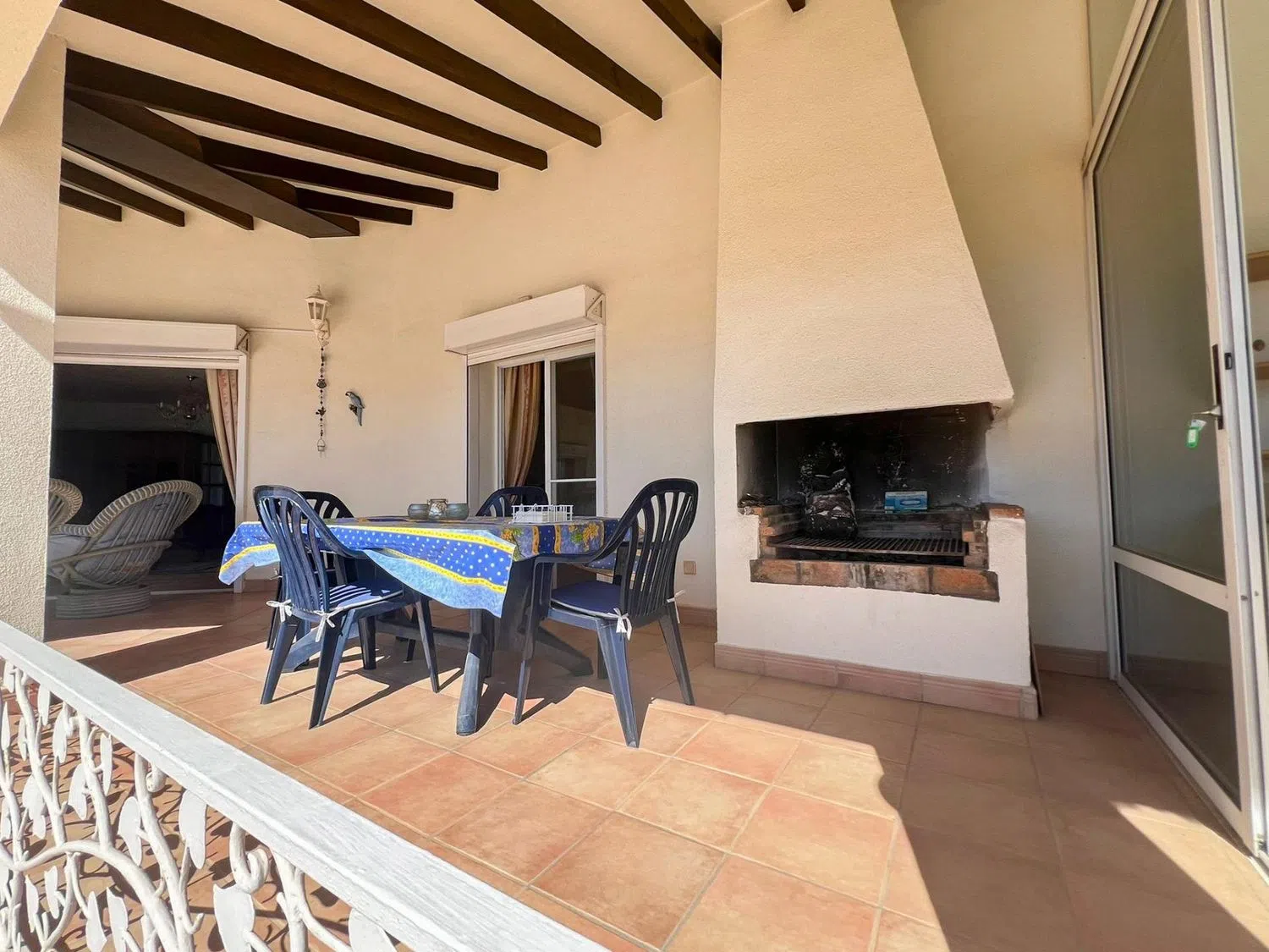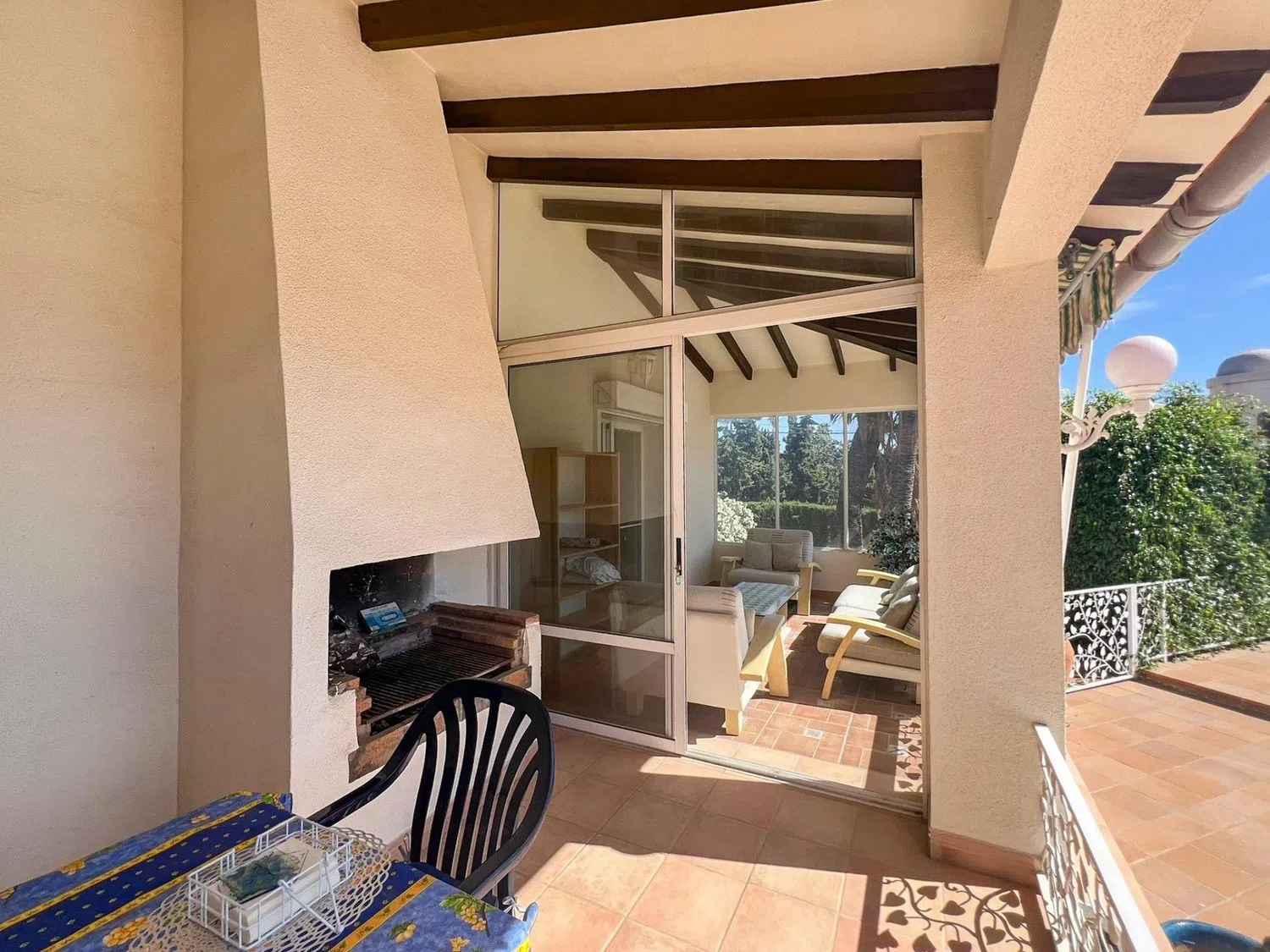 Adjacent to the living room, you will find a separate dining area that connects to covered terraces; one of these terraces is equipped with an outdoor fireplace, allowing you to enjoy the fresh air even in the cooler months. Part of the terrace is glazed, providing the opportunity to use it year-round.