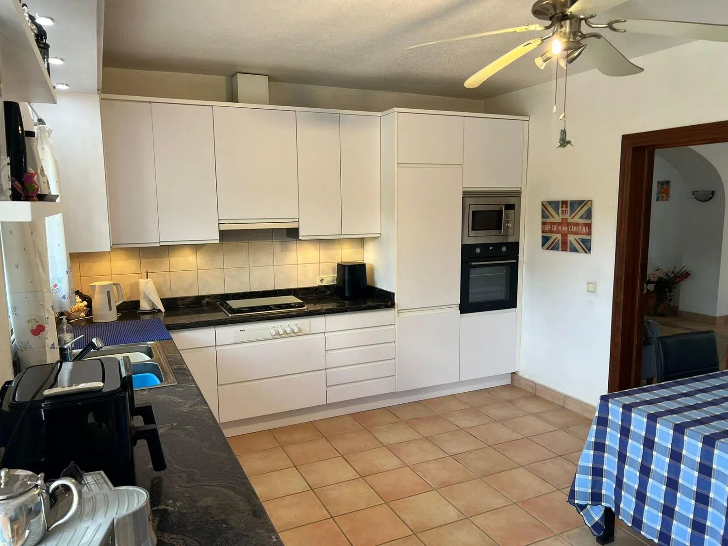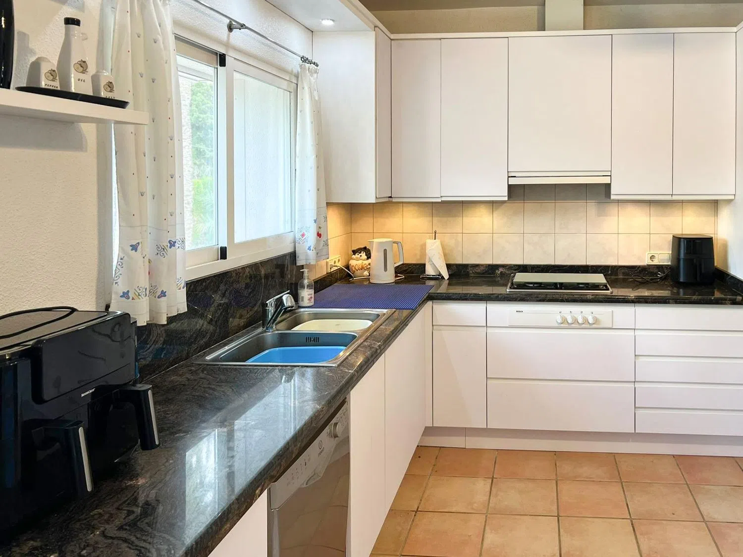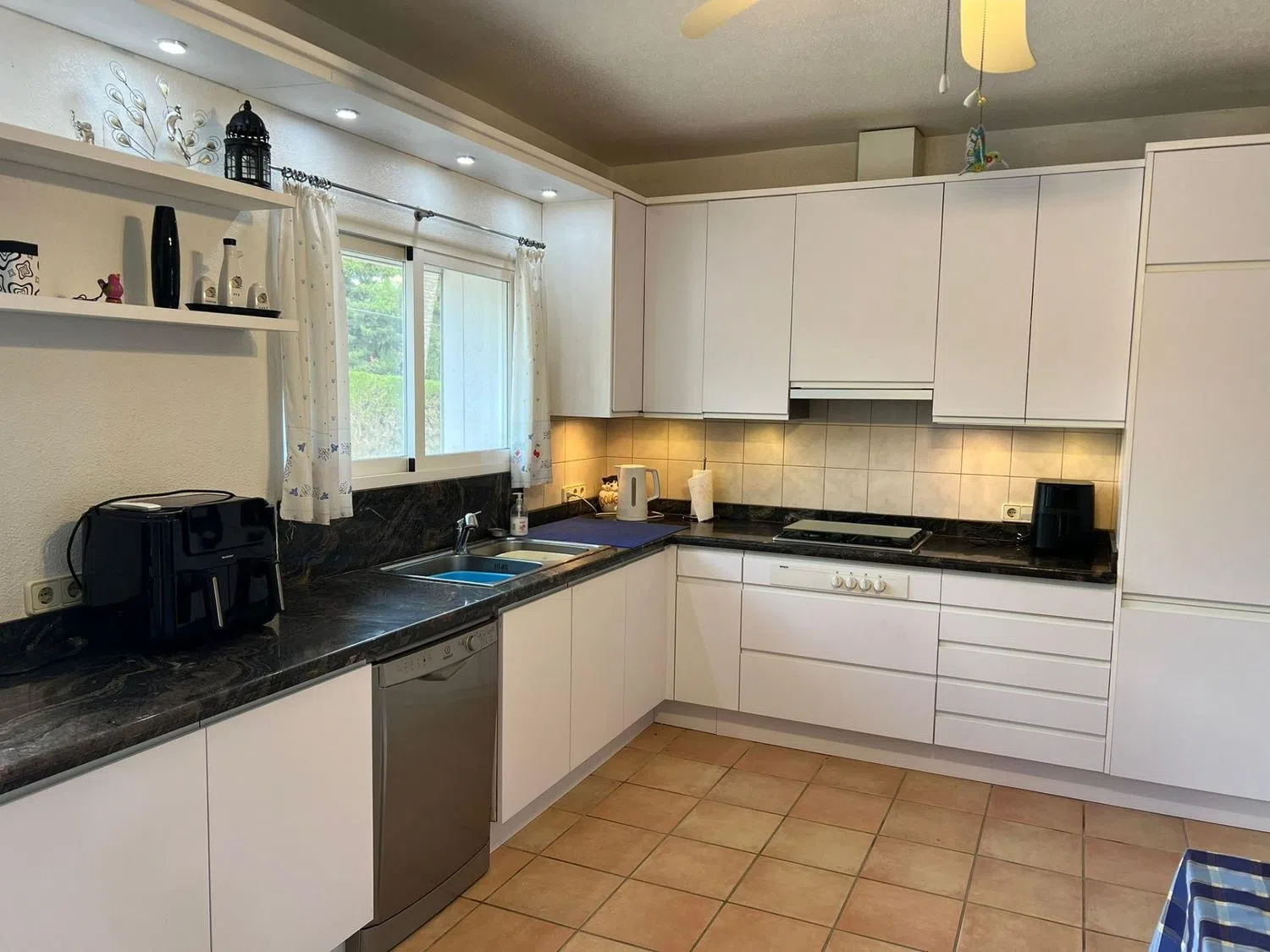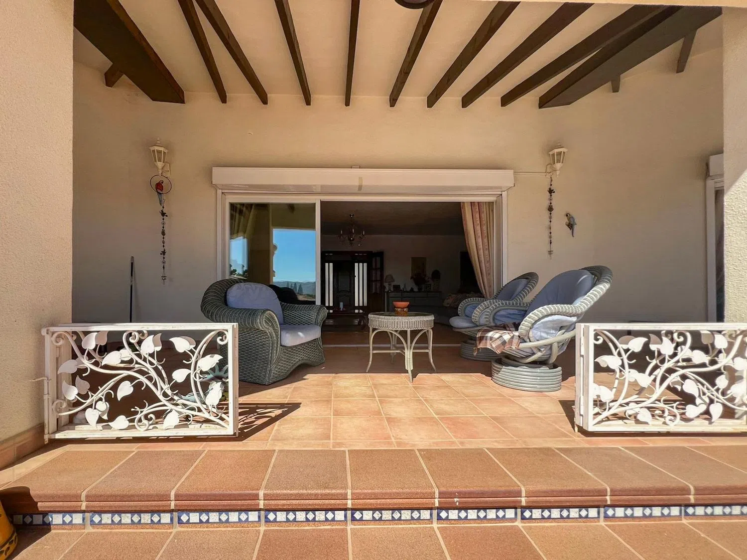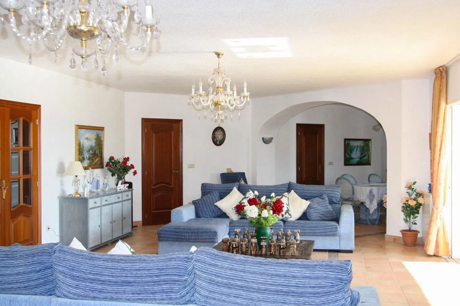 Adjacent to the living room, you will find a separate dining area that connects to covered terraces; one of these terraces is equipped with an outdoor fireplace, allowing you to enjoy the fresh air even in the cooler months. Part of the terrace is glazed, providing the opportunity to use it year-round.