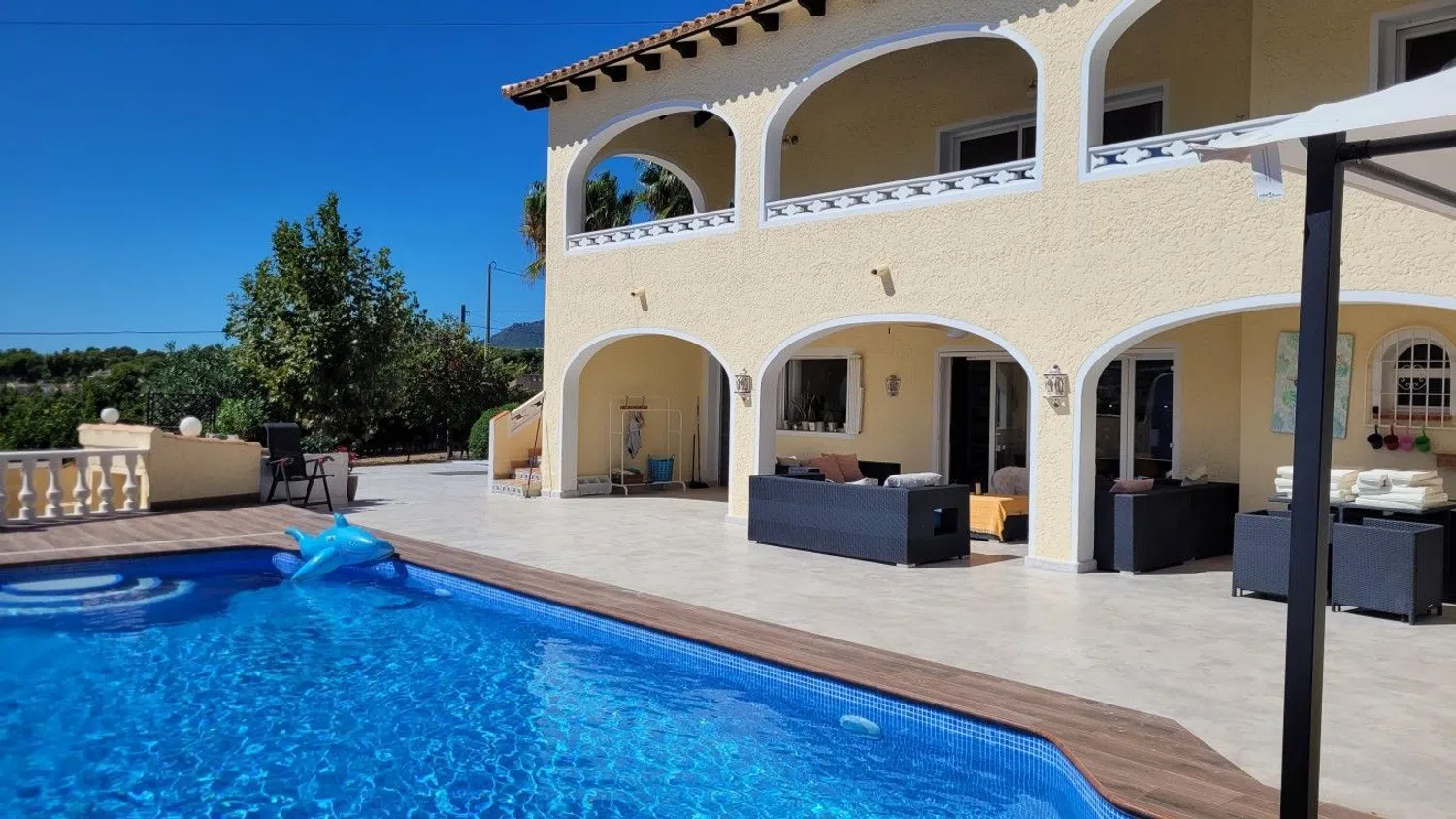 This home has been thoroughly renovated both inside and out, featuring new windows, refreshed landscaping, updated pool filters, and newly laid terrace tiles, with fresh paint applied throughout. Situated in a serene and picturesque area, it offers stunning views of the sea, mountains, and orange groves. It is conveniently located just a 10-minute walk from the center of town and a 20-minute stroll to the beach.