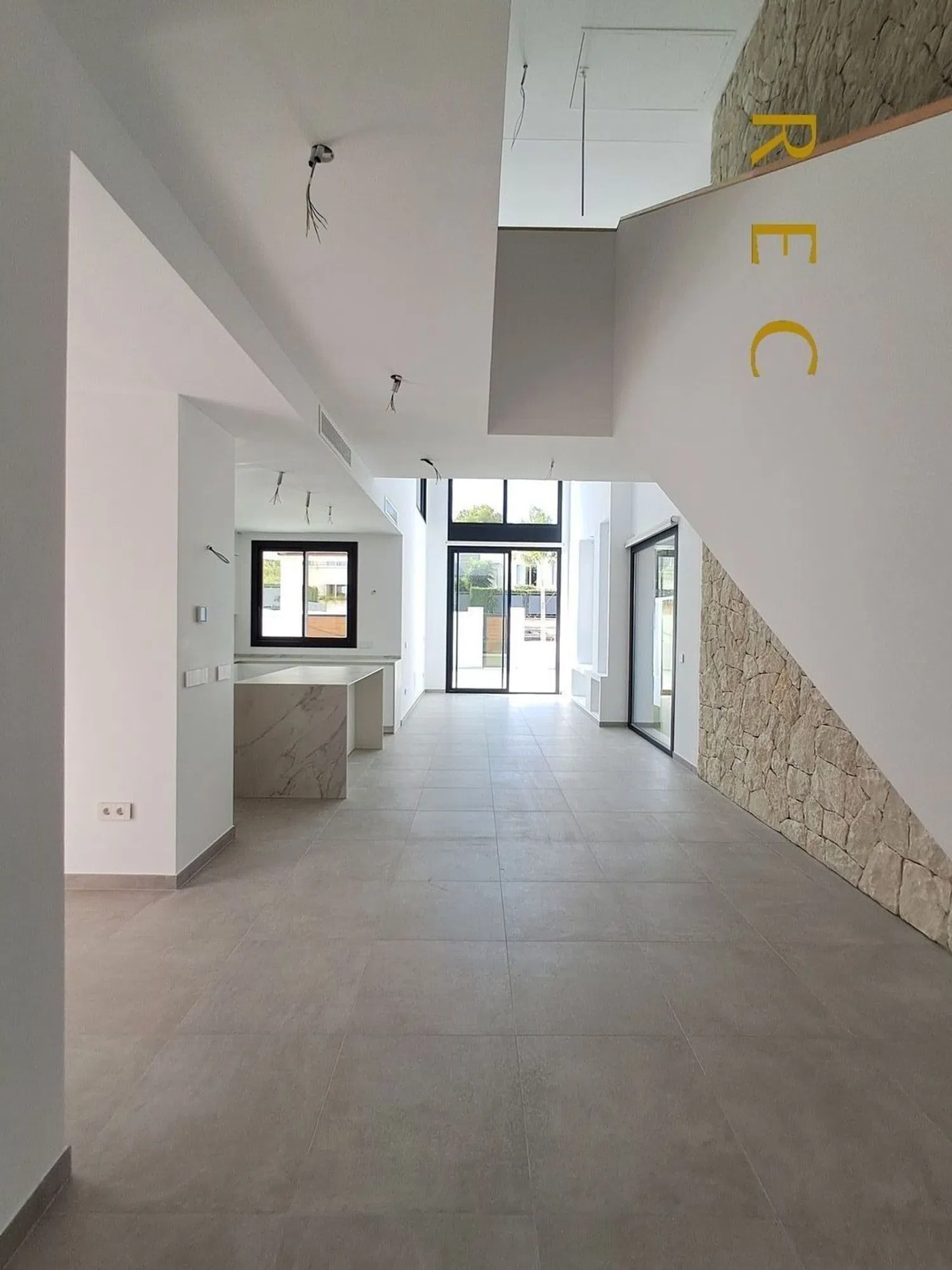 High-end features include aluminum carpentry with thermal break, double glazing for enhanced safety and insulation, a modern climate control system, and porcelain stoneware flooring with luxurious finishes in the kitchen.