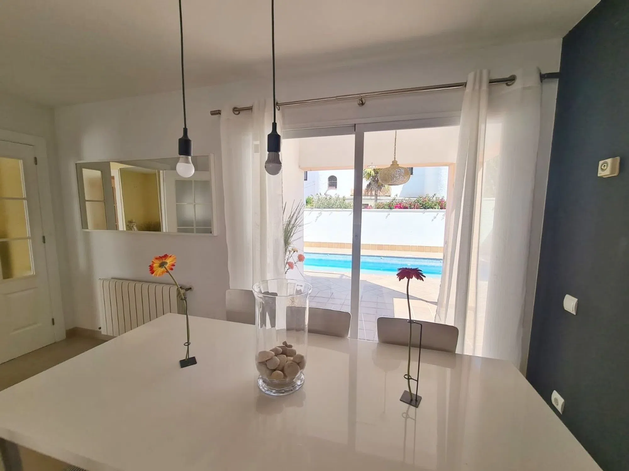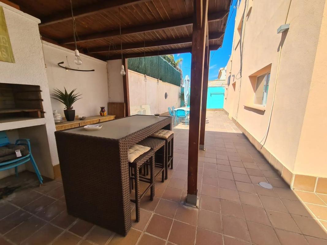 Bonito Chalet independiente de estilo moderno a pocos metros del centro de El Albir, Supermercado Consum, farmacia, parada de autobús, restaurantes etc. La vivienda en 2 plantas esta distribuida de la siguiente manera Planta Baja: Amplio salón comedor con acceso directo a la piscina privada, Cocina independiente con acceso directo a la piscina, 1 dormitorio y 1 aseo. Primera planta: 2 dormitorios con baño en suite, 1 con terraza En la parcela se encuentra la piscina comunitaria, zona de Barbacoa y amplio garaje. Si esta buscando una casa independiente y muy céntrica en el Albir, tiene que visitar esta casa. [IW].