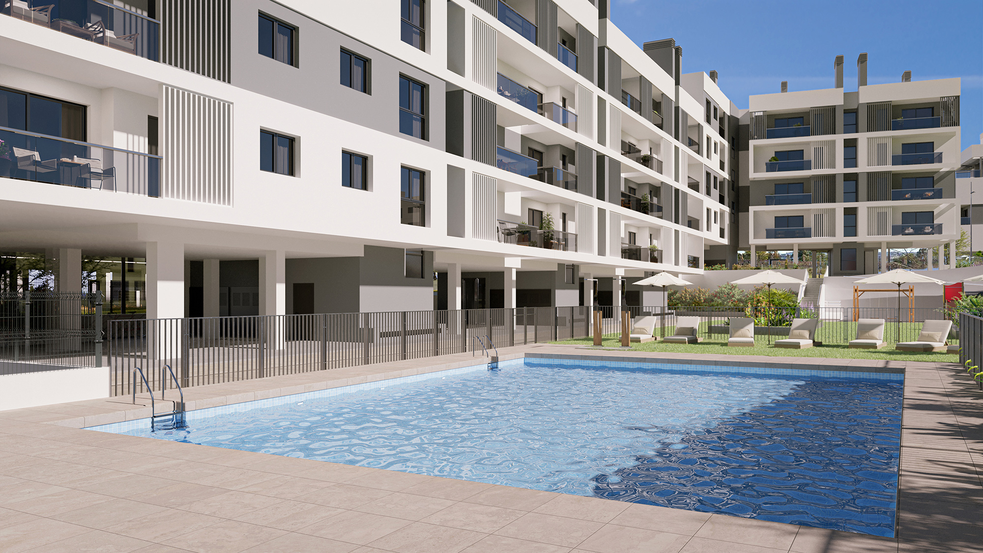 The building features 48 units with 3 bedrooms, surrounded by a lush green area, a children's playground, and a communal swimming pool. Its elevated position relative to other structures ensures that residents enjoy exceptional views. Prices range from 279,000 € to 408,000 € and include a parking space and a storage room. Discover your new home today!
