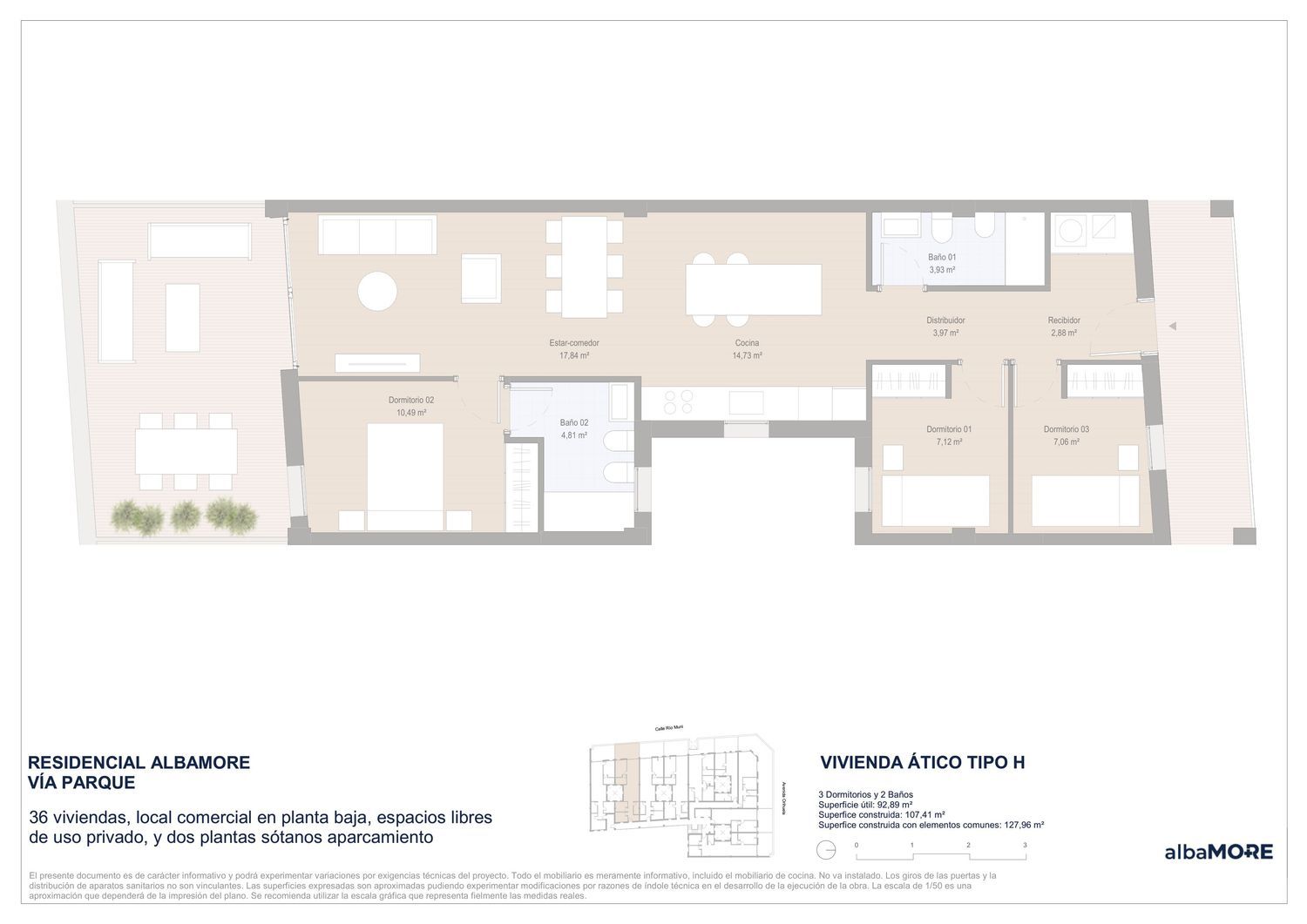 Nuevo residencial Albamore vía parque: viviendas de alta calidad, situadas en Avenida Orihuela número 113.Viviendas de 1, 2, 3 y 4 dormitorios con superficies desde 77 a 145 m2 con calificación energética B. Ofrecemos al cliente posibilidad de elección en materiales y distribuciones para la obtención de su vivienda totalmente personalizada. El residencial cuenta con zonas comunes y piscina. Además incluye plaza de garaje y trastero incluido en el precio de la vivienda. Todo ello desde 162.000€ + I. VA Imágenes no contractuales y meramente ilustrativas sujetas a modificaciones de orden técnico, jurídico o comercial de la dirección facultativa o autoridad competente. El mobiliario de las infografías interiores no está incluido y el equipamiento de las viviendas será el indicado en la correspondiente memoria de calidades.