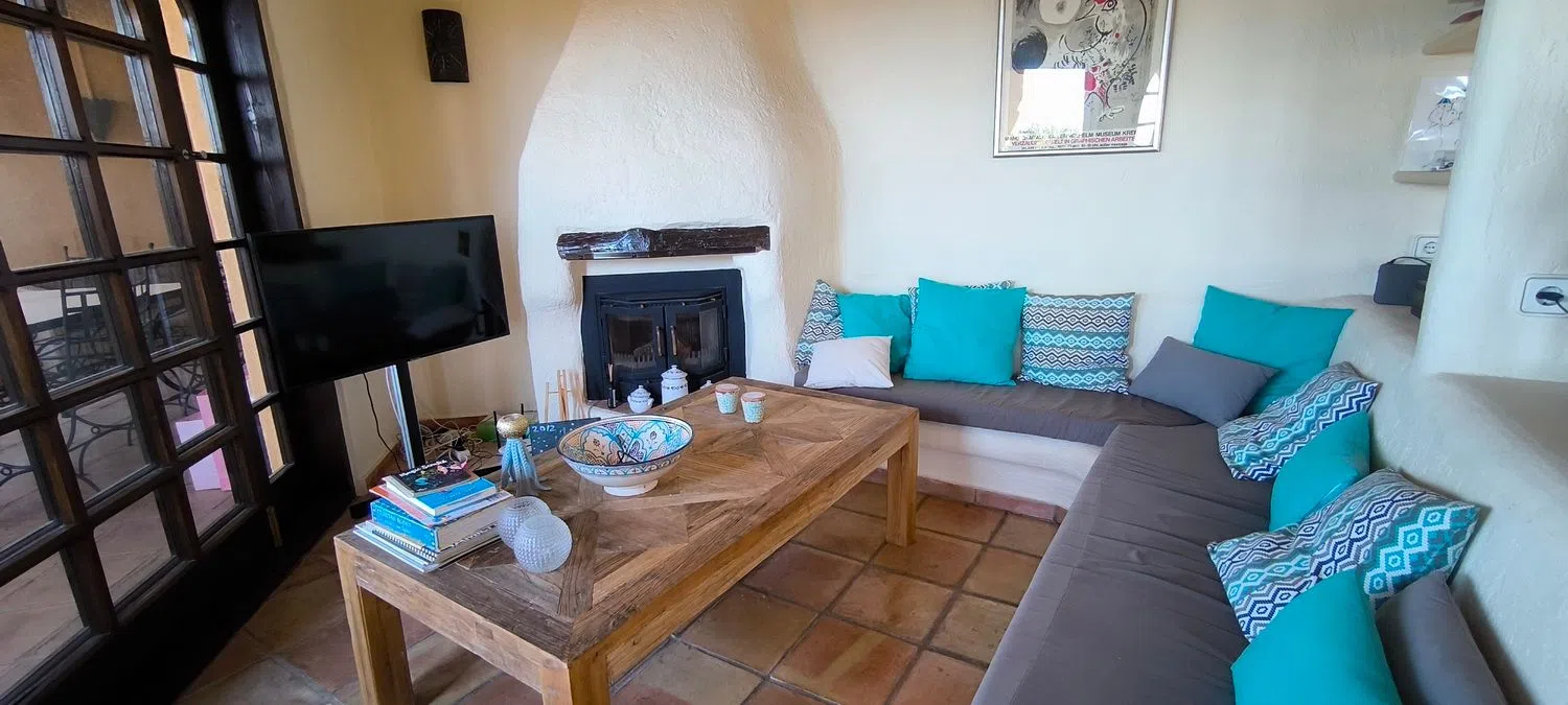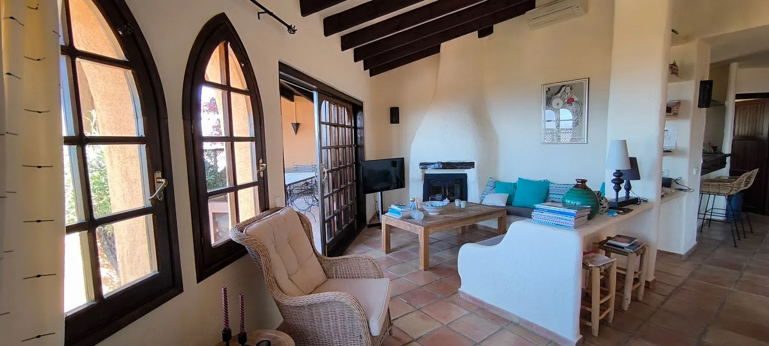 The layout of the home features an inviting entrance hall that leads to a spacious living-dining area divided into several cozy sections. An open-concept kitchen enhances the flow of the space, complemented by an additional sitting room complete with a fireplace. From the living areas, you can access two expansive terraces, each offering stunning vistas.