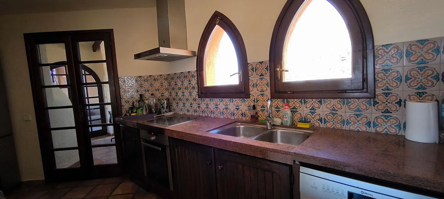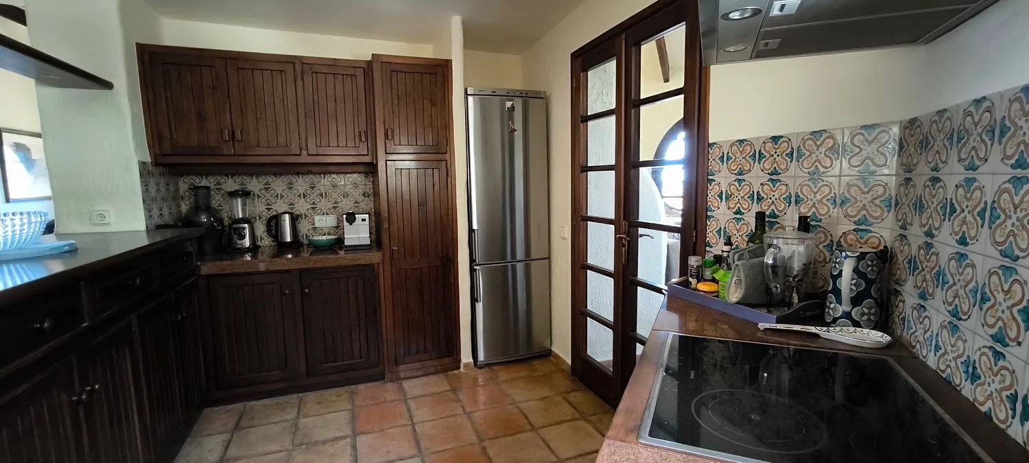 There are four well-appointed bedrooms, including a primary suite with a walk-in closet, an en-suite bathroom, and direct access to one of the terraces. Another full bathroom with a shower and a separate laundry room complete the interior. The penthouse is equipped with air conditioning and underfloor heating, with charming wooden beams and windows that add character, along with handcrafted clay flooring.