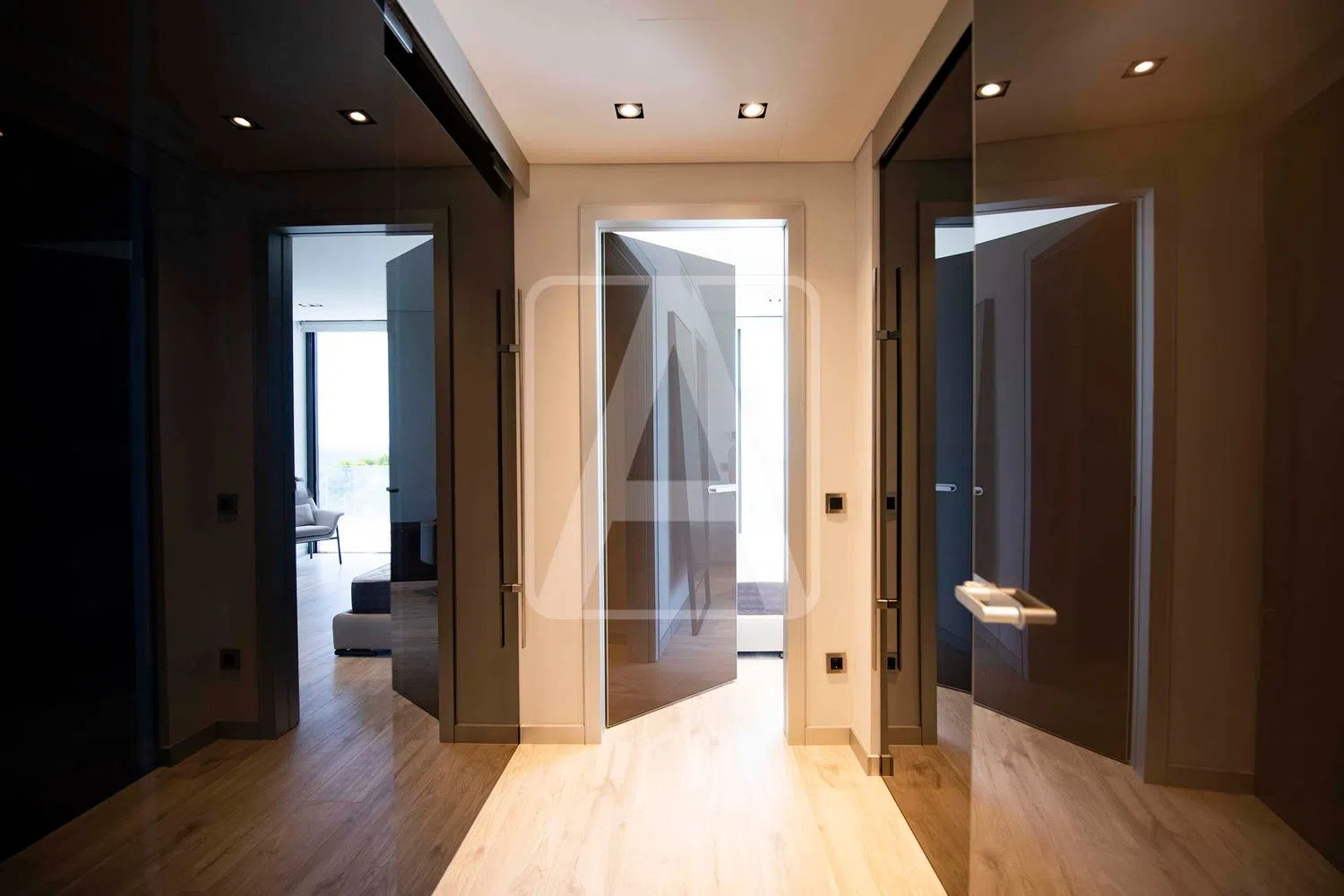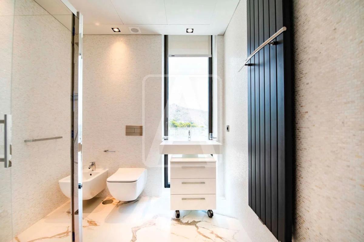 On the upper level, the entry hall spans 20 m2 and leads to three spacious bedrooms, each with ensuite bathrooms, as well as a walk-in closet measuring 8 m2. Step out onto the 25 m2 terrace to enjoy the fresh air and views.