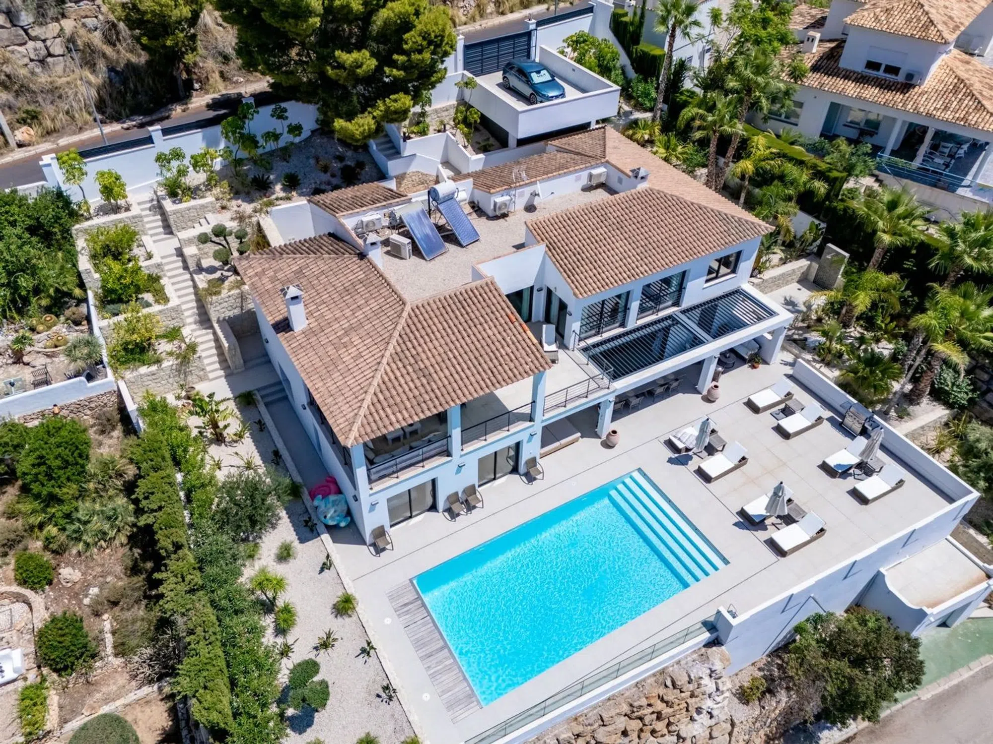 Presentamos una magnífica propiedad en Altea La Vieja, ideal para quienes buscan comodidad, amplios espacios y, quizás, las mejores vistas de Altea. La propiedad tiene una superficie construida de 387 m² y una parcela de 1017 m². Ofrece 6 amplios dormitorios y 5 baños, perfectos para disfrutar de la privacidad y el confort que se merece. La casa y las zonas exteriores han sido completamente renovadas con un estilo elegante y materiales de primera calidad, combinando modernidad y funcionalidad. La propiedad está orientada al sur y goza de sol desde la mañana hasta la tarde. Las fantásticas vistas le dejarán sin aliento. Disfrute de momentos inolvidables en su piscina privada y en la espectacular zona de barbacoa y cocina exterior. La planta superior consta de un amplio recibidor con armario empotrado que conduce a un espacioso salón, comedor y cocina abierta con acceso a una gran terraza cubierta y descubierta con inmejorables vistas al mar, a Altea y a la montaña. Aquí también se encuentra el dormitorio principal con un exclusivo y espacioso baño con ducha y bañera. En esta planta también hay dos dormitorios mas y dos baños con ducha. La planta baja consta de tres amplios dormitorios, dos con baño privado. Aquí también encontrará una bonita cocina y zona de barbacoa con acceso a una gran terraza cubierta con una exclusiva solución de pérgola con una gran mesa de comedor, zona de estar y zona de relax. La zona de la piscina es espaciosa y ofrece mucho espacio para tomar el sol y jugar. Aparcamiento para 2 coches en un aparcamiento con portón eléctrico y un garaje cerrado también con portón eléctrico. Esta casa, ubicada en una calle tranquila, no es solo un hogar, sino un estilo de vida. [IW].