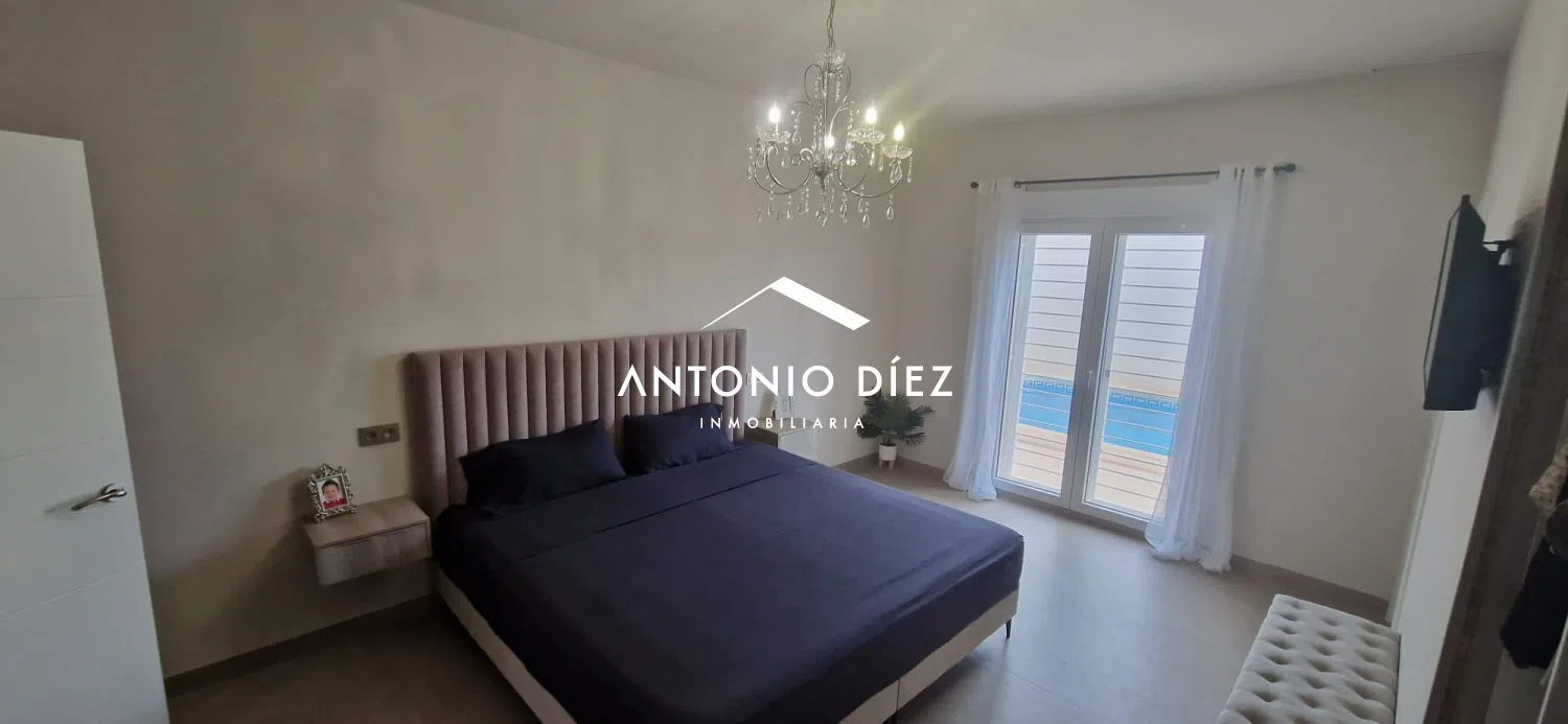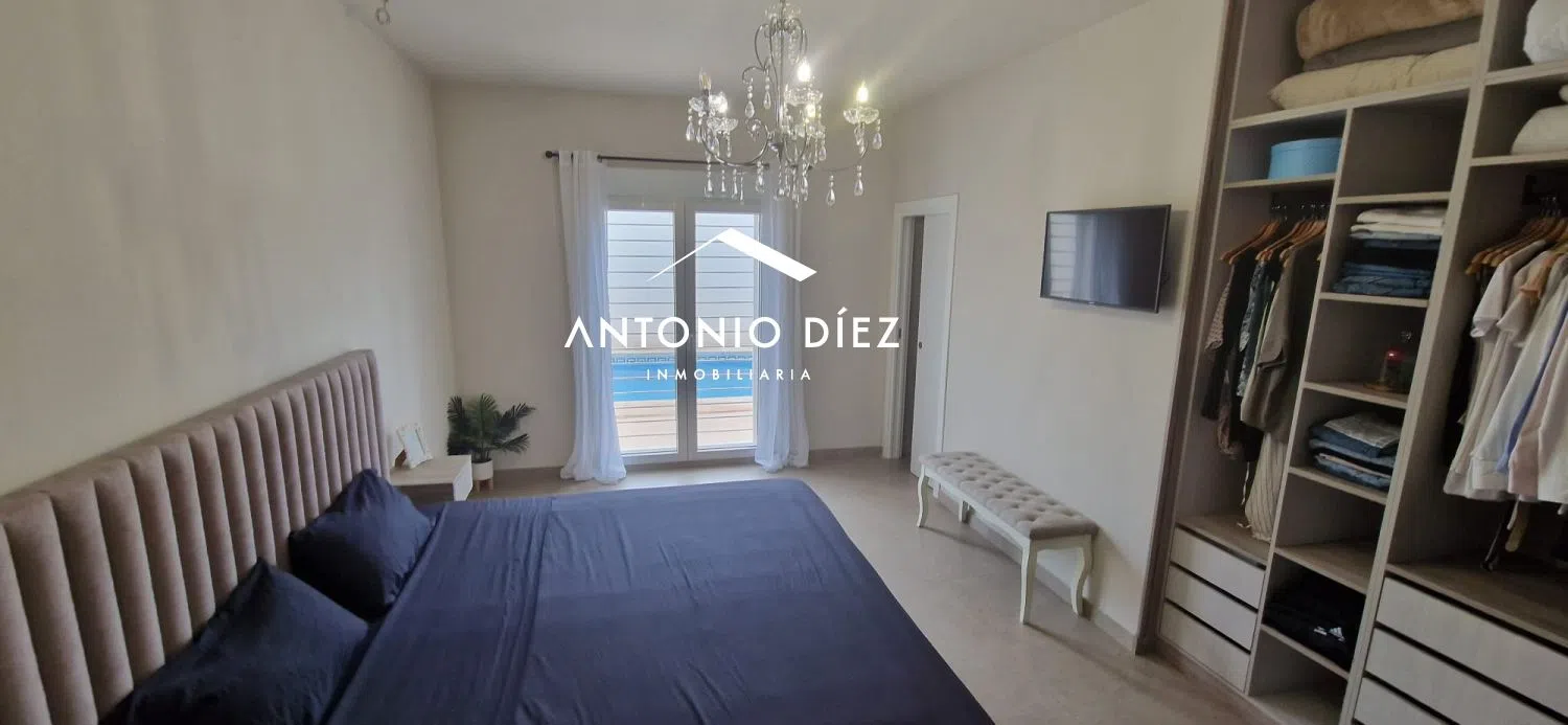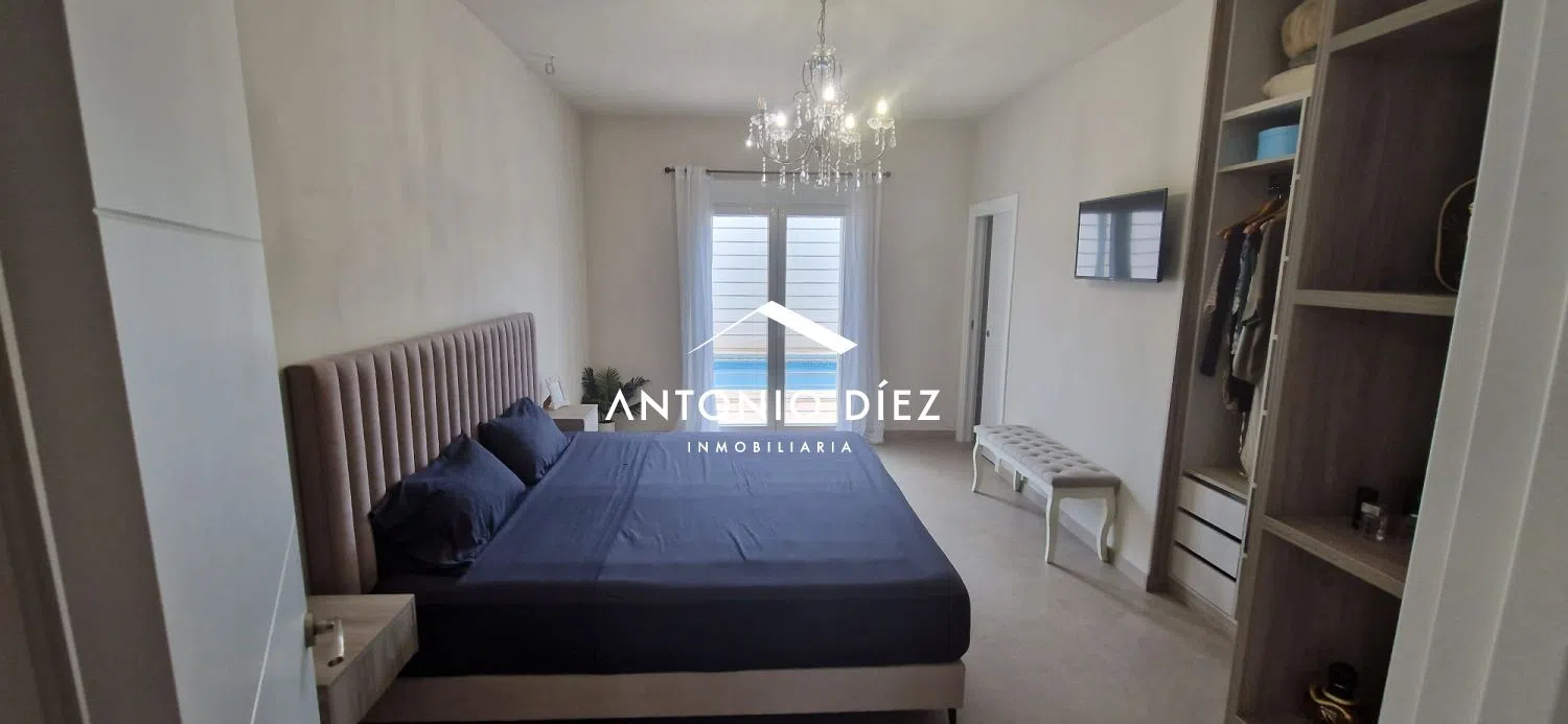The main residence is a beautifully appointed family home, featuring every modern convenience and luxury. Access is gained through a generous 70-square-meter terrace or porch that leads into the open-plan living and dining area, seamlessly integrating the kitchen. A thoughtful layout distinctly separates the private sleeping areas from the public living spaces, enhancing comfort and privacy. A central hallway provides access to a full bathroom equipped with a shower, two bright double bedrooms adorned with LED lighting, and a master suite complete with an en-suite bathroom and walk-in closet. Every detail has been meticulously crafted to prioritize energy efficiency, strategically placed lighting, and utmost functionality.